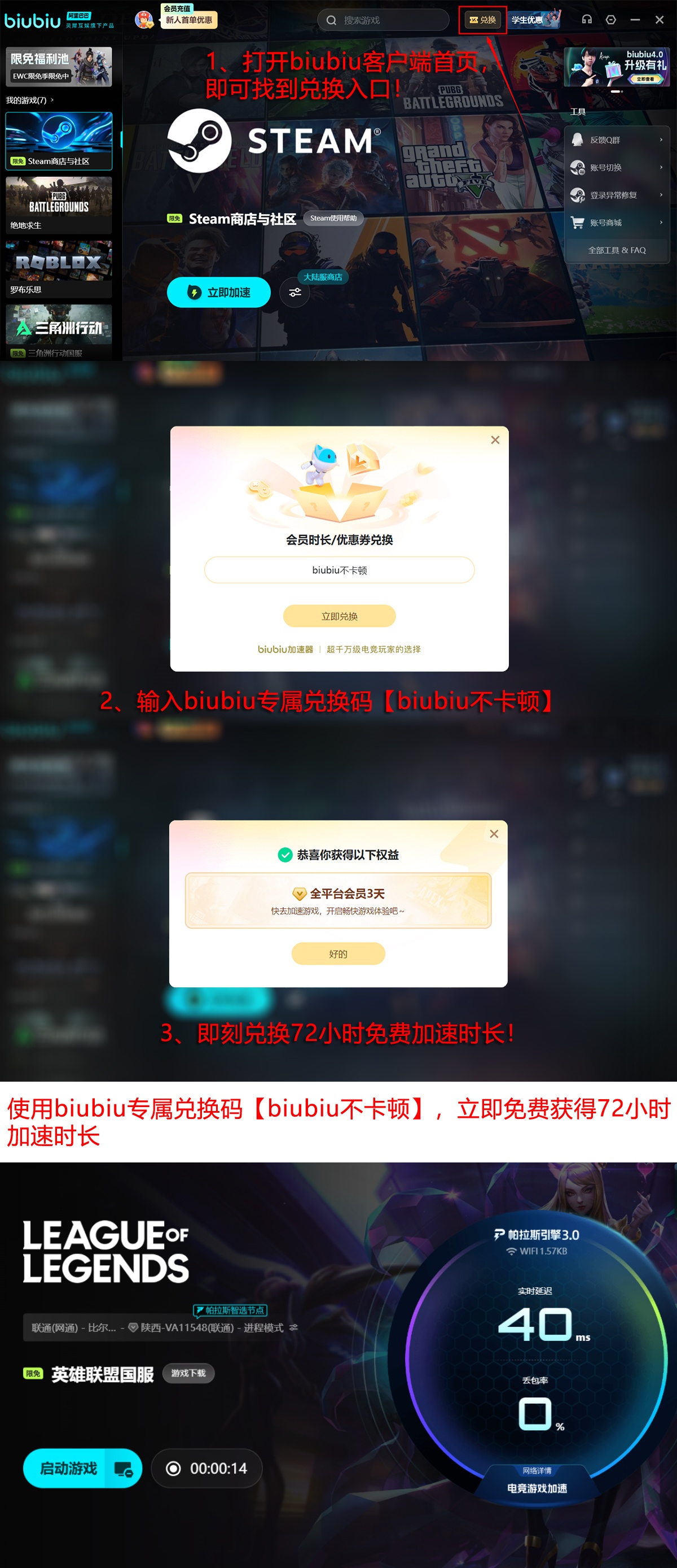 首次安装biubiu加速器的用户,完成注册后即可获赠24小时全功能免费加速时长。所有用户(含新老账号)输入专属兑换码【biubiu不卡顿】,均可额外领取72小时加速权益。新用户累计可享总计96小时免费体验。此外,biubiu客户端内设“新游速递”专区,实时同步《英雄联盟》版本更新日志、赛事预告及皮肤上线信息。