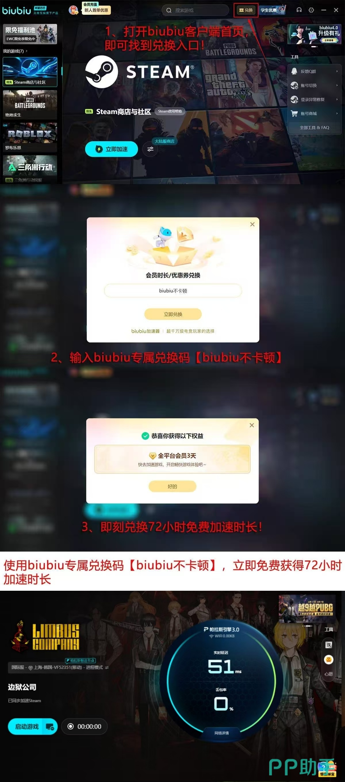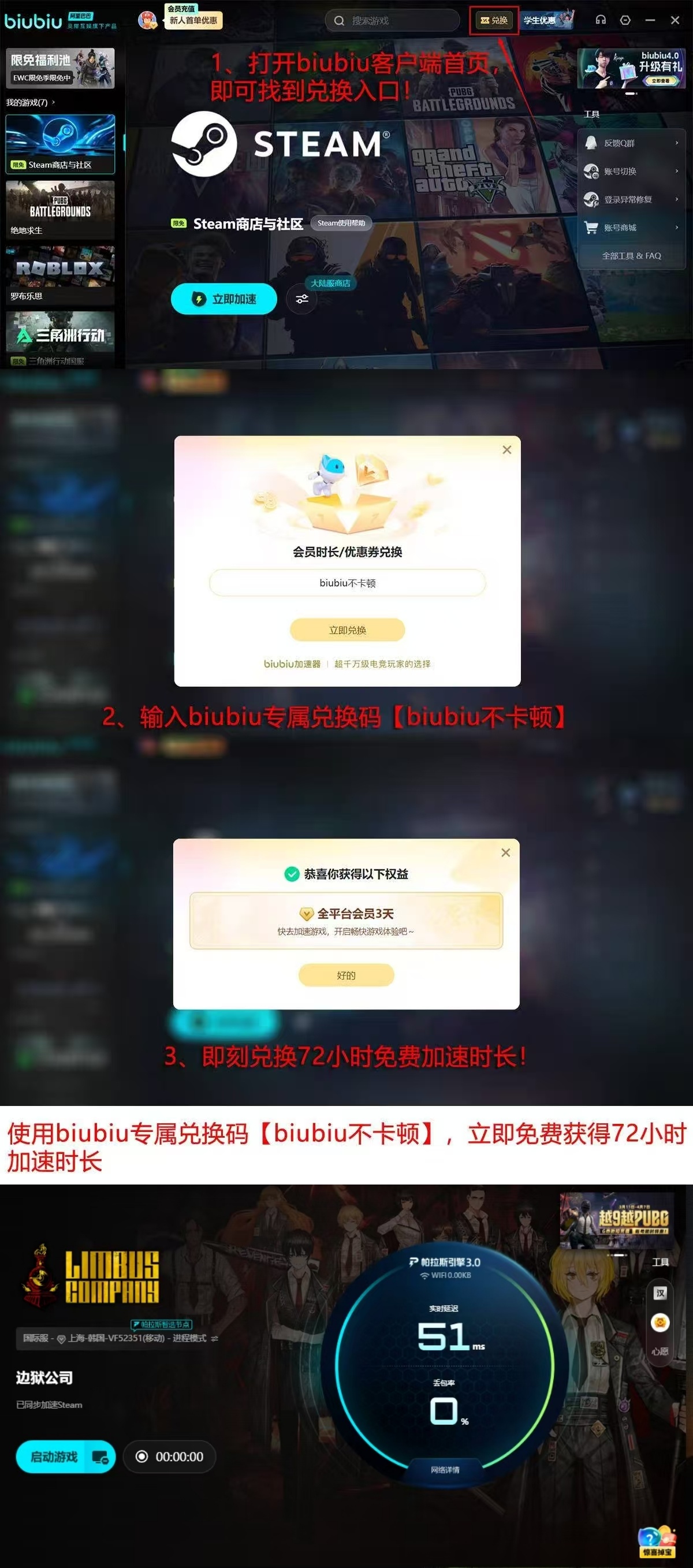 新用户注册biubiu加速器,即可免费激活首日24小时全功能权限,输入【biubiu不卡顿】,额外领取72小时加速时长!双福利叠加,畅享总计96小时的顶级加速体验。