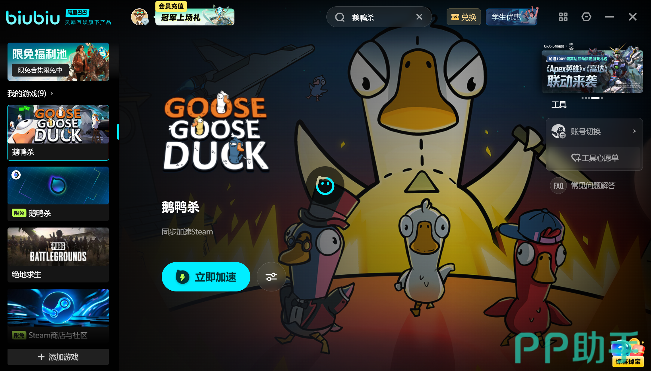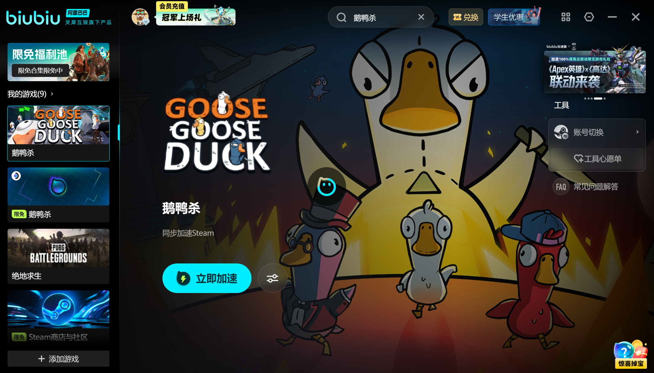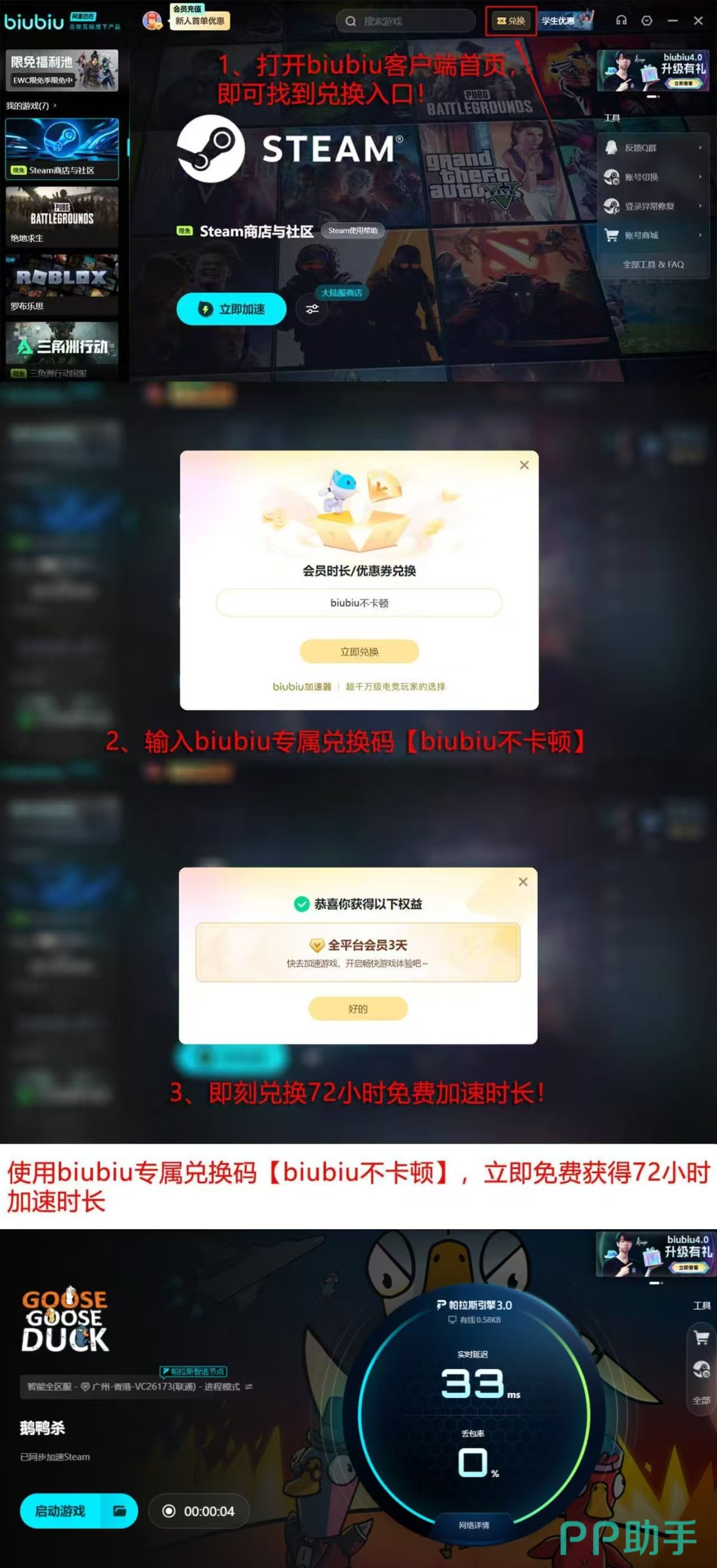 针对用户关心的使用成本,biubiu加速器提供明确的免费体验机制:新注册用户可立即获得24小时全功能加速时长,无需绑定支付方式即可完整体验《鹅鸭杀》全流程。此外,所有用户均可通过软件内置“兑换中心”输入口令【biubiu】不卡顿,额外领取72小时高级加速权益。两项福利叠加,总计可享不少于96小时的零门槛高性能网络服务。