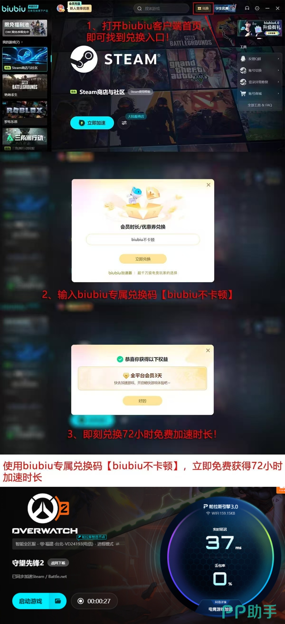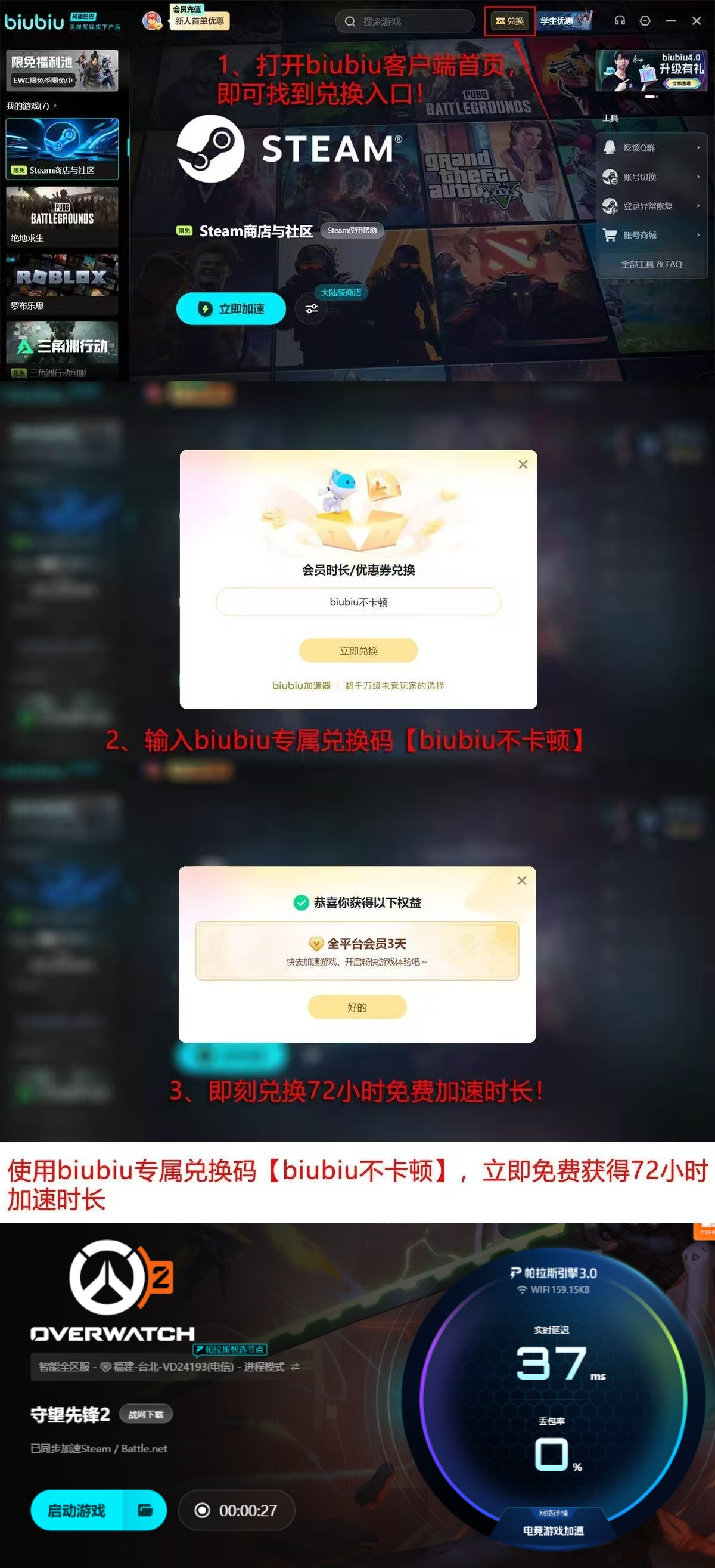新用户注册即可获赠首日24小时全功能试用权益;输入专属口令【biubiu不卡顿】,还可额外领取72小时高级加速时长,累计享有96小时无忧加速服务。