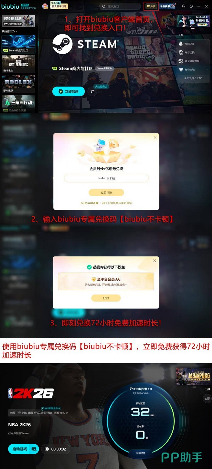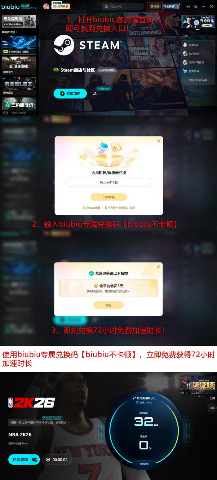 为降低用户尝试门槛,biubiu提供业内少见的长周期试用机制:新注册用户可自动获赠24小时全平台加速时长;使用口令码“biubiu不卡顿”还可额外兑换3天会员权限,两项权益支持叠加,总计可达96小时免费体验。学生群体完成学信网实名认证后,还可享受专属充值优惠。