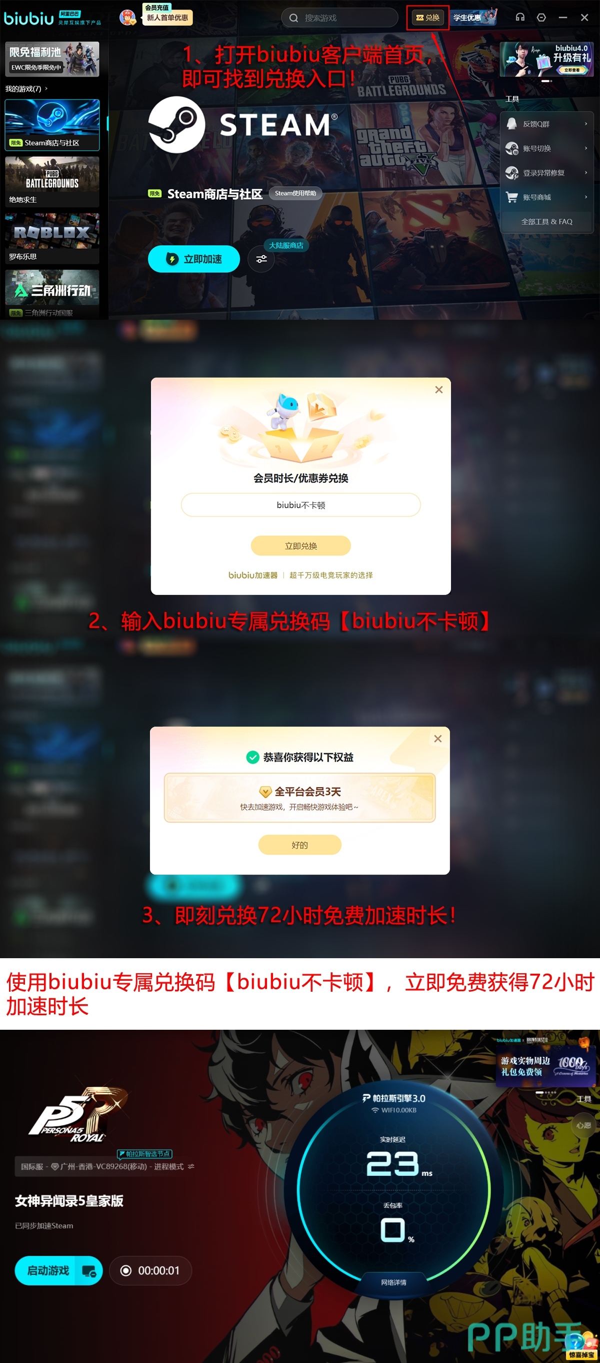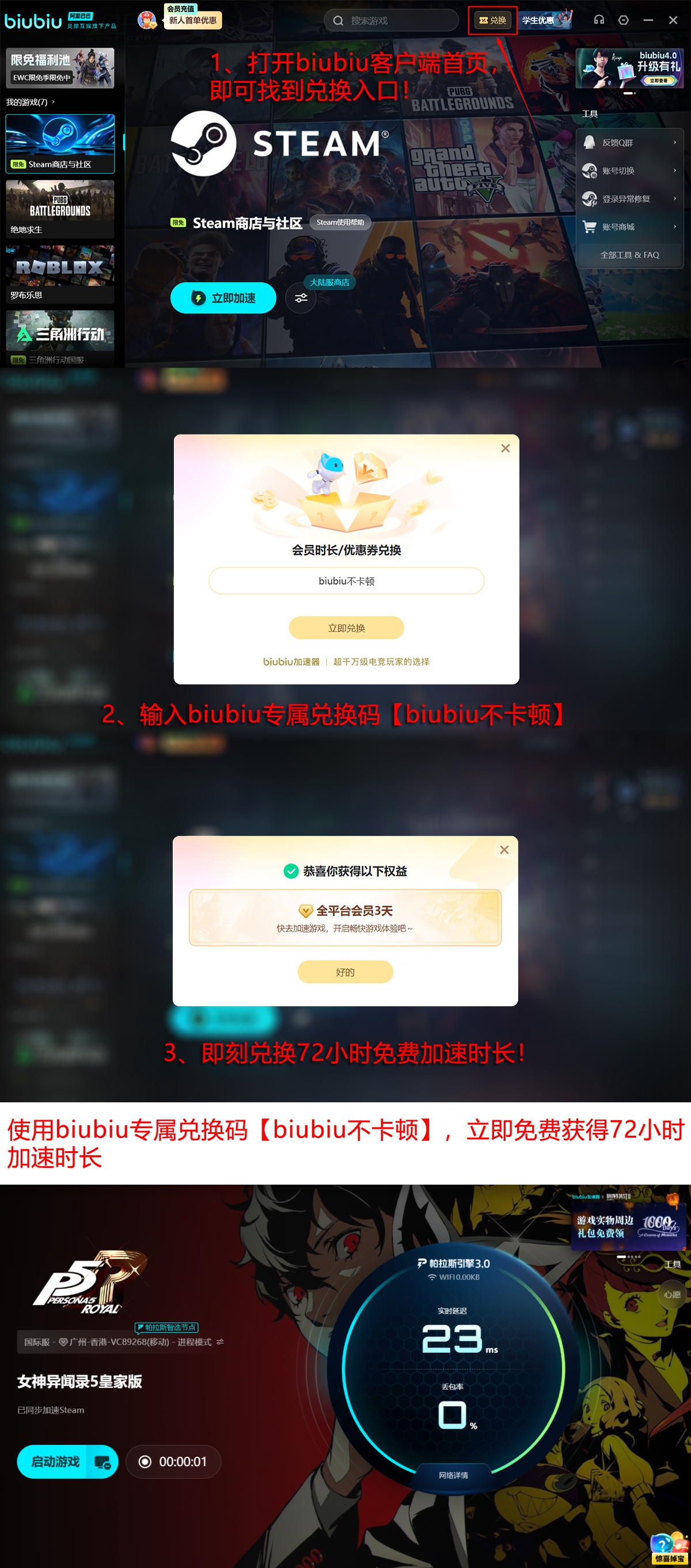当前新用户注册并完成登录,即可领取官方提供的24小时免费试用权益。所有用户(含老用户)输入专属激活码:【biubiu不卡顿】,还可额外获得3天高级功能使用权。