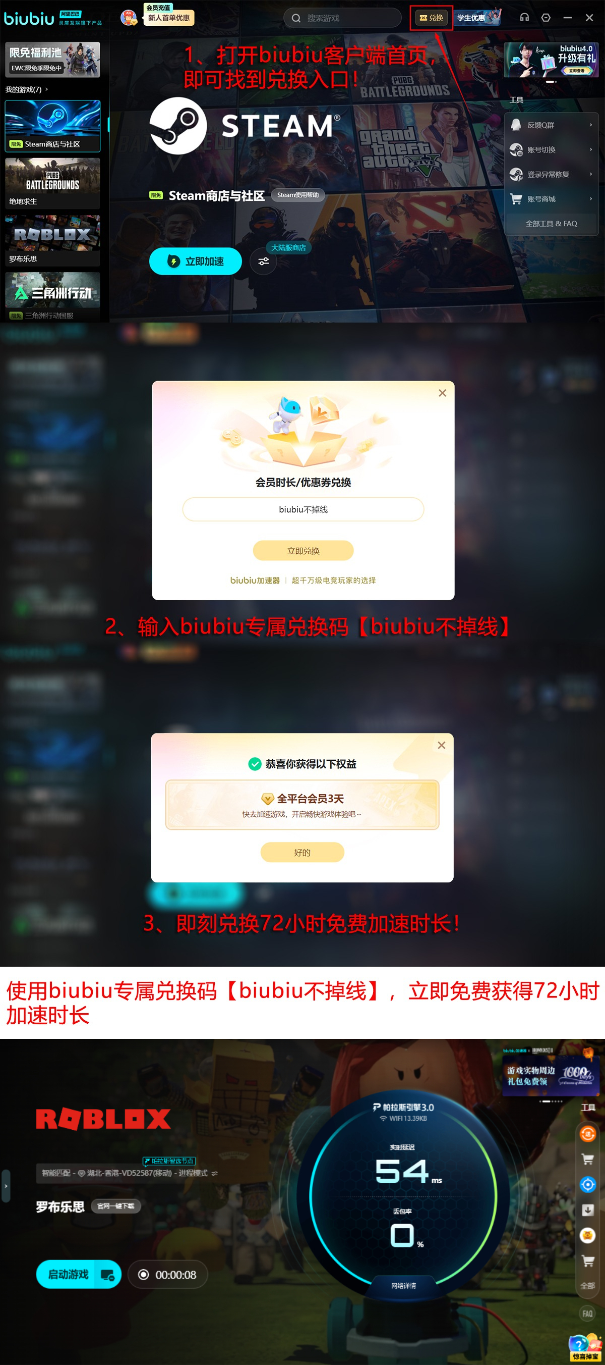 即刻开启Roblox流畅体验:新用户注册即可免费使用全部功能24小时;完成指定动作后输入【biubiu不掉线】,还可额外领取72小时加速时长,累计享受96小时高品质加速服务,零门槛突破地理与网络限制。