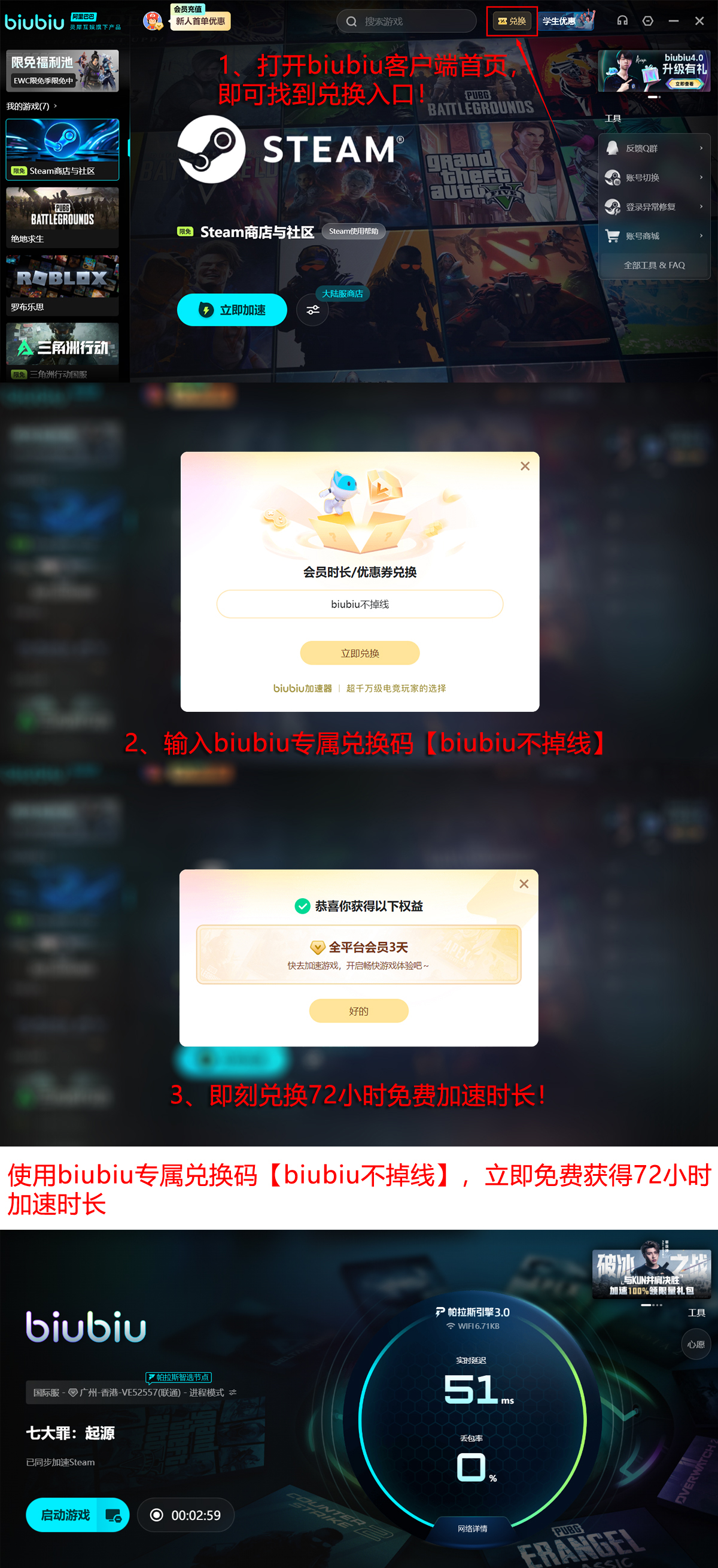战斗全程建议启用综合性能最佳的biubiu加速器保障网络稳定性。该工具搭载帕拉斯3.0加速引擎,由阿里巴巴灵犀互娱技术团队深度优化,支持九游、交易猫及biubiu加速器三端统一加速协议。新用户完成注册并登录即可领取24小时免费加速时长;另可凭激活码【biubiu不掉线】额外兑换72小时使用权,累计达96小时。后续平台将持续上线更多限时福利活动。