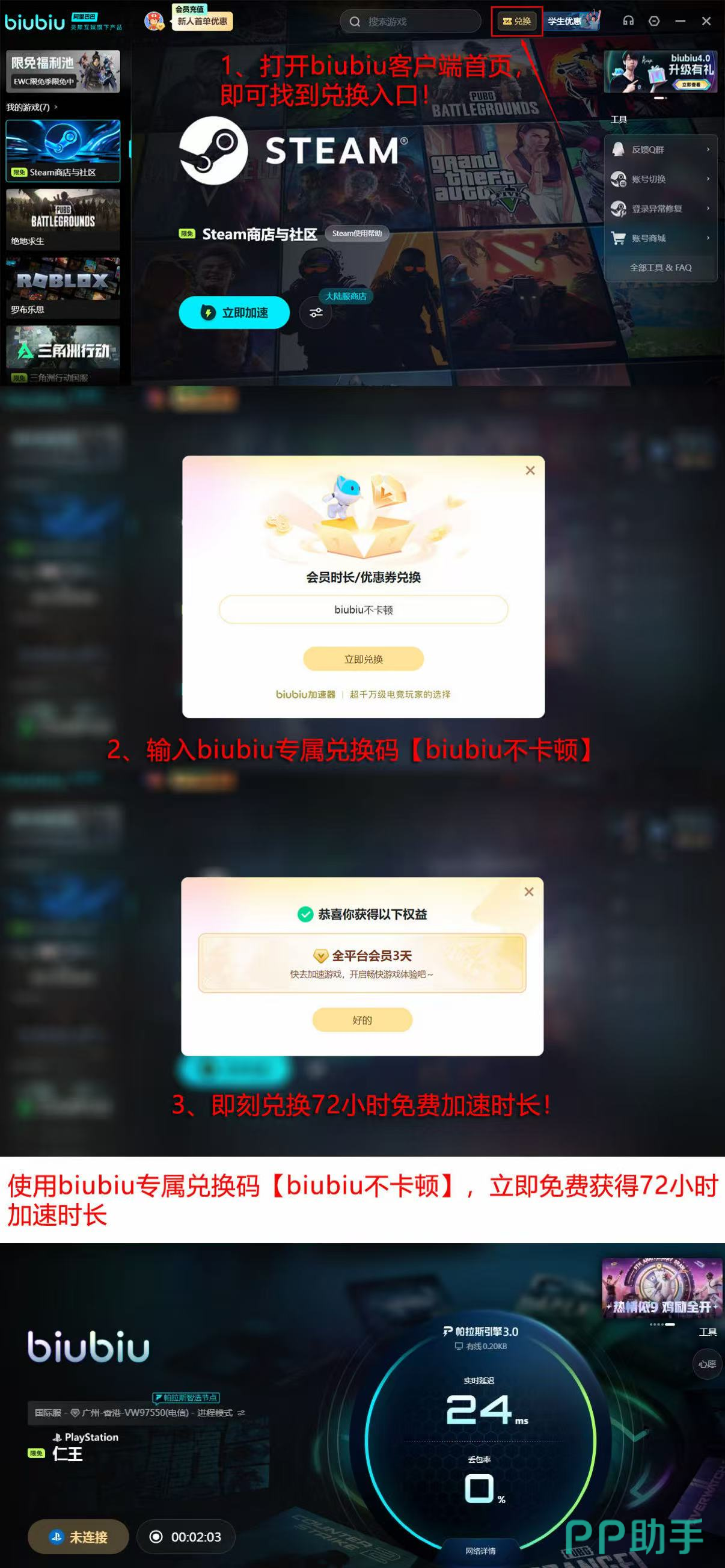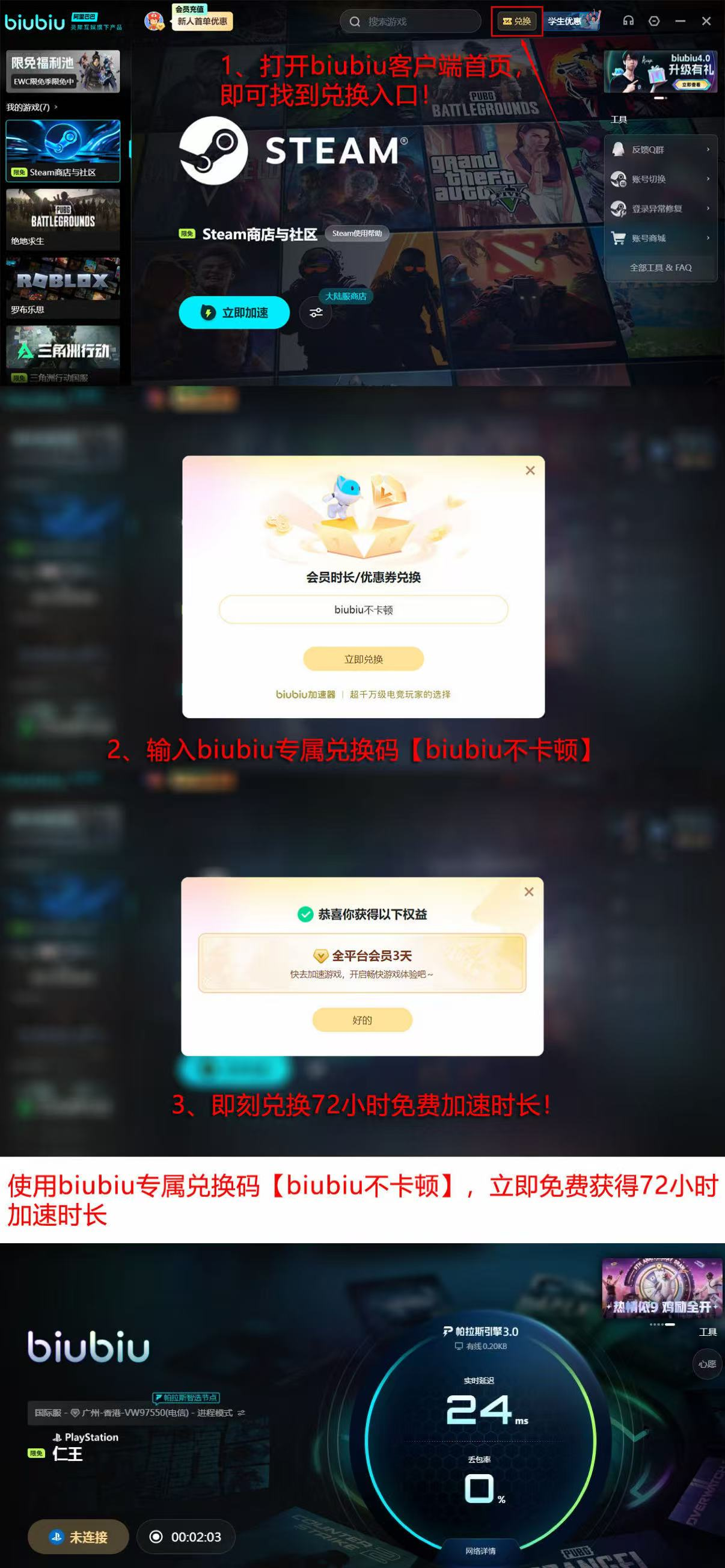 biubiu提供无门槛试用机制:新用户注册即赠24小时全游戏免费加速时长;所有用户均可凭兑换码【biubiu不卡顿】领取额外72小时加速权益。会员服务定价合理,长期使用成本远低于单次购买高配硬件升级投入,同时享有覆盖千款主流游戏的限免加速池等专属福利。
