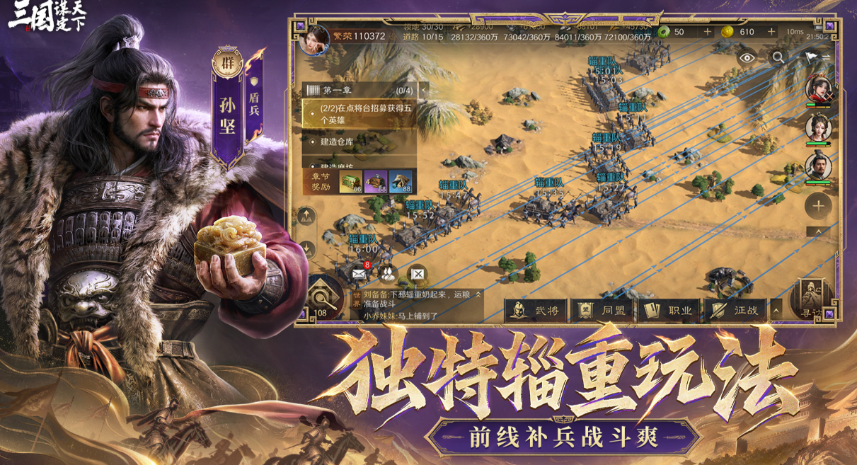 写实向大规模策略沙盘手游,支持单服最高10万人同图作战。采用地理信息系统(GIS)还原东汉末年地貌水文,兵种克制、天气影响、城池攻防均基于历史参数建模。战役模式引入时间压缩机制,关键决策点触发史实事件回溯,强化战略纵深感与历史代入感。
