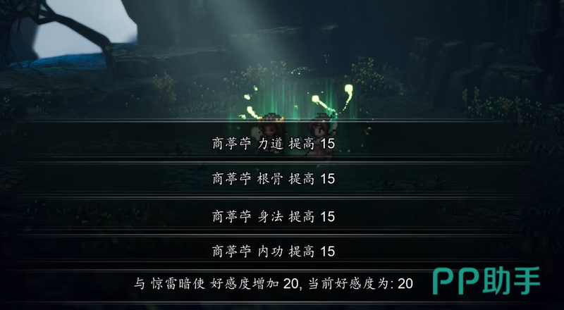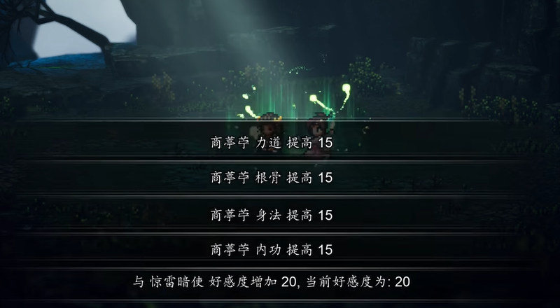 准备进入和濮山庄前,队伍也要调整一下。如果带了商亭苧,那这一段优先整编商亭苧。如果没有带她,那就整编娜乌。处理好后去找道微,对话结束就能前往和濮山庄。到了这里会有一个治疗惊雷暗使的环节,完成后惊雷暗使好感提升20点。这里谁来治疗,最后拿到的培养收益也不同。如果是商亭苧治疗,那么她会获得提升,增加15点力道、15点根骨、15点身法和15点内功。如果是娜乌和顾思归来治疗,那么这份提升会给到娜乌,数值也是15点力道、15点根骨、15点身法和15点内功。从结果看,这也是不少玩家不带药圣走绮罗筵的原因。