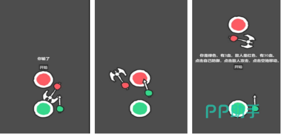 虽然在游戏画面上来看,并没有色彩缤纷的画面,只是由黑色作为背景,但是其中却有两种不同的对手将会展开一场指尖的决斗。其中的绿色人物就是自己,每次都有三种血,而敌人是红色的,大家在整个战场的局势当中,不光要防御好自身的安全,同时还需要通过点击敌人的方式发起攻击,在每次点击空地时就可以合理移动。