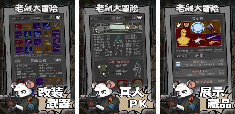 《老鼠大冒险》采用的是可爱的动漫卡通画风,且游戏内的老鼠形象都十分生动可爱,玩家只需要操控老鼠,在各个地图中冒险即可。手游并没有AI系统,战斗时全部都是真人PK,战斗结束后,还会有交易系统方便玩家交易道具和装备。对于想要提升战斗力的玩家来说,手游还提供了武器改装系统,方便玩家打造独一无二的枪械。