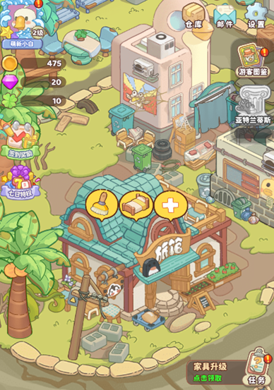 游戏可以切换好几种不同的场景,选好喜欢的人物之后,不用任在做任务,就是慢慢的在沙滩上逛,晒晒太阳,吹吹海风,整个人都能快速的放松下来。除了休闲逛景,还有经营的玩法,在街道上可以自己建各种店铺,大家可以试一试开奶茶店,或开一些小吃摊,看着过往的旅客过来消费,一点一点的把街道变热闹,那种成就感还挺特别的,不会觉得枯燥,反而更容易上头。