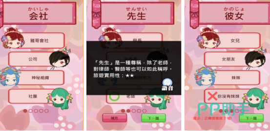 以问答形式为核心的日语学习游戏,采用寓教于乐的问答机制,收录了超过上百个高频生活实用词汇,比如寿司等等,玩家要根据具体的题目来选择出正确的汉字或者理解其含义,在闯关的过程当中,学习到日语汉字的读音和相应的意义,每关都设有道五道题目,全部答对之后就能够解锁之后的关卡。