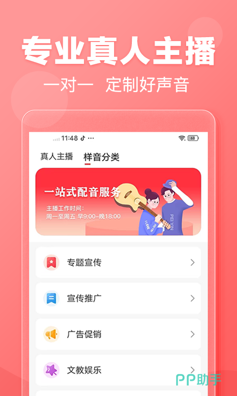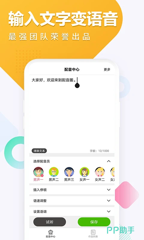 一款专业文字转语音的配音软件,支持输入中文或英文直接朗读。很适合用于商店广告、促销配音、地摊叫卖录音或者英语听力制作,多个不同音色的男女主播任你挑选,还支持调整语速或者添加背景音效,海量配音模板等着你来挑选。