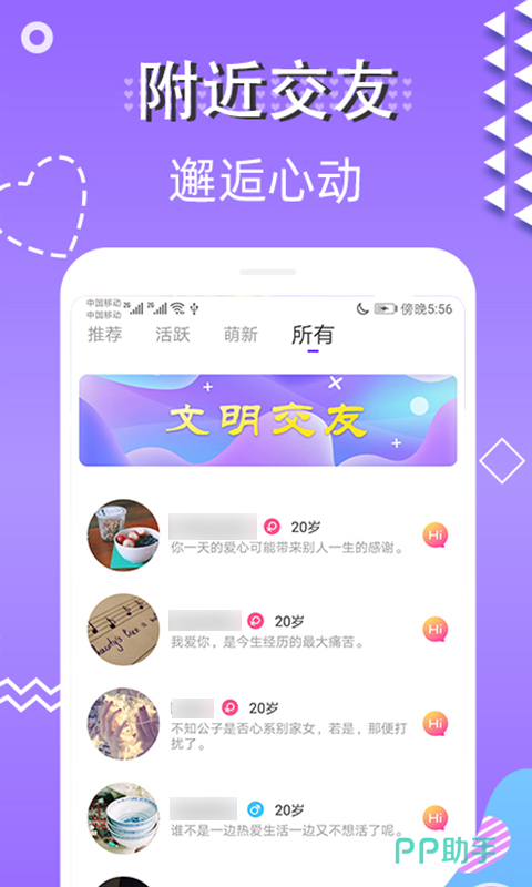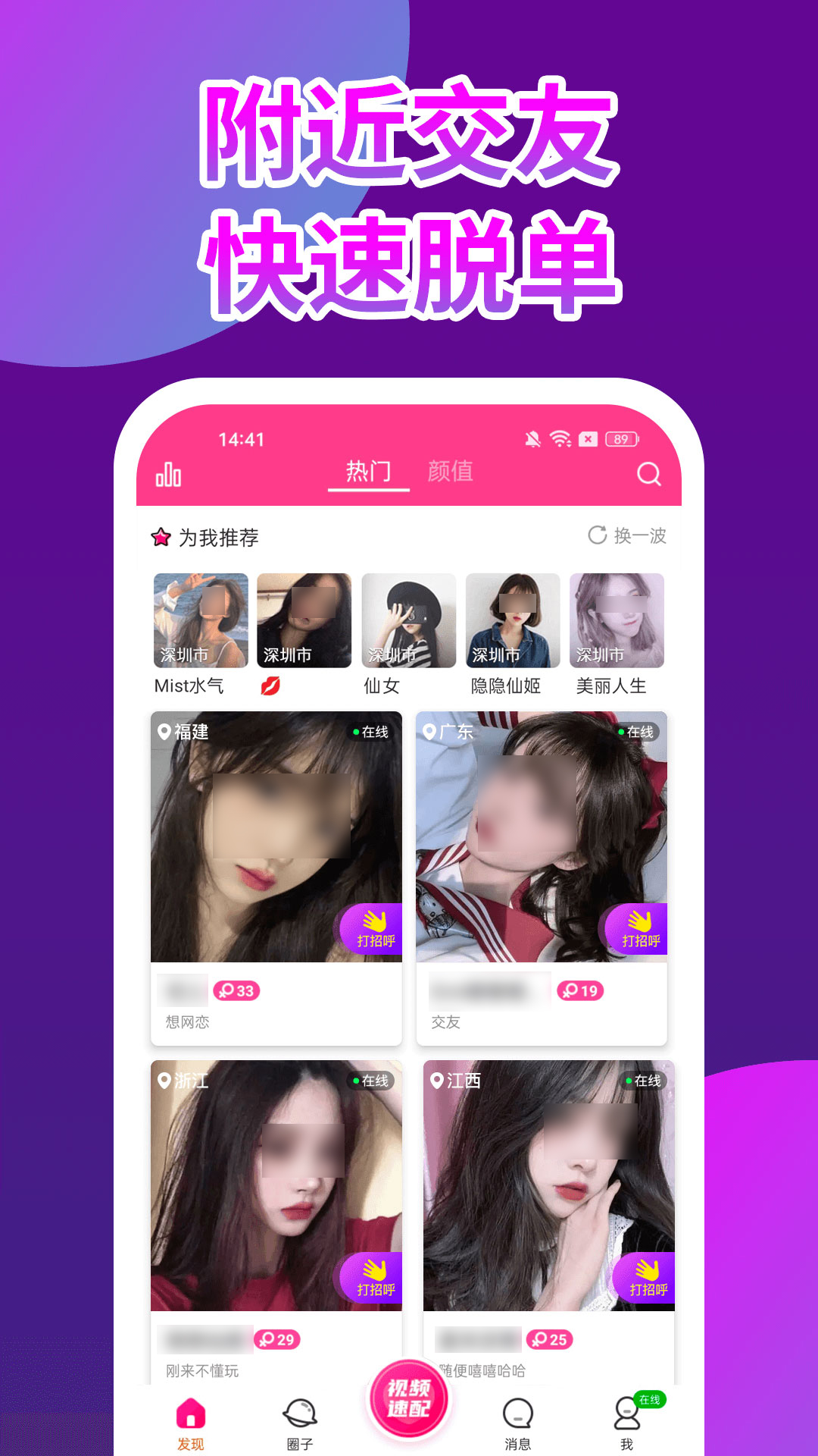 如果身处商圈、或者写字楼附近,想要快速认识身边的同龄人,那么就可以试试这个app,它可以精准推送附近的活跃人群,有很严格的审核把关,不担心资料掺假。在下班路上随手点开,就能一键打招呼开启闲聊,还能通过短视频来开启一段速配邂逅,隔着屏幕也能快速熟悉彼此,轻松打破初次结识的一些陌生感。