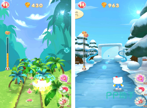 这款能看到可爱凯蒂猫融入了跑酷玩法的游戏,将会让大家进入充满着清新的游戏环境里,无论是在绿色的森林,或者是白雪皑皑的周边环境当中,都需要你控制着角色,利用正确点击屏幕的方式,完成跳跃以及跑步的动作,这样就能收获更多的道具。再搭配上轻松又好听的音乐,也能享受所具备的趣味性,由凯蒂猫正版授权。