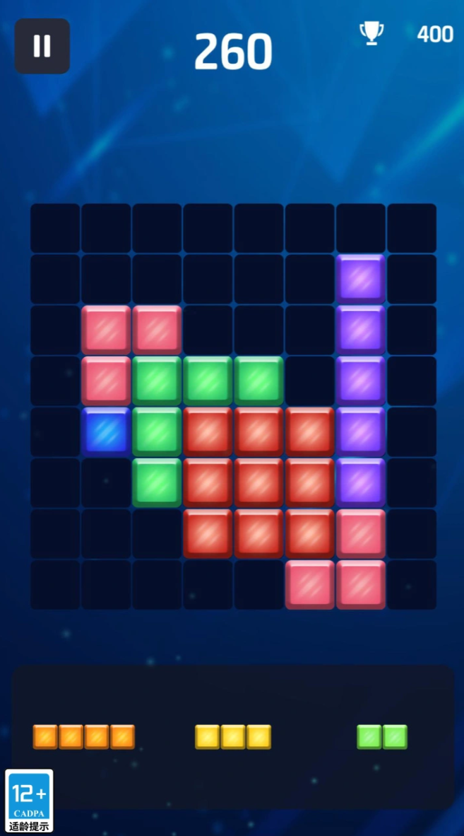 只需要通过调整掉落板块的位置和方向,使他们能够在屏幕的任意地方拼出完整的一条或者几条,就会达到消除的效果,这样就能够给新落下来的方块腾出更多的空间,使自己的分数也能够达到更高。在游戏界面的下方还会提供三个不同类型的方块,玩家只需要根据屏幕中方块的排列,而为他们寻找合适的位置,这样也能够帮助玩家去消除更多的板块。