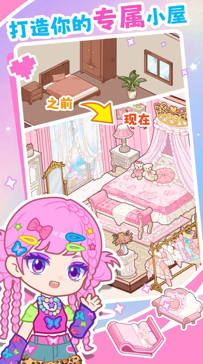 根据自己的喜好去装扮不同的房屋,每一个房屋的构造也是不同的,因此玩家可以有多种装饰的体验。卡中还包含了收拾房屋和装修的过程,让玩家能够全面地感受装饰房屋带来的快乐,需要将房屋之前的所有破旧家具以及脏乱的地方进行打扫,让整个房间看起来更加的焕然一新,拥有几百种家具,玩家可以自由的挑选,将它们全部搬进自己的房间。