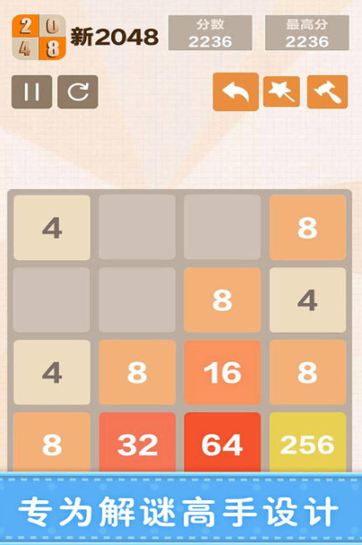 此游戏里,你可以推动数字方块,让相同数字的方块合二为一,形成一个双倍数字的方块,直至得到有一个2048方块或者满屏都是不能移动合成的数字方块才算结束一局,在玩的时候可以活跃你的脑力思维,让你预防老年痴呆。游戏会显示你的历史最高得分,才让你知道自己这次挑战是否有进步。