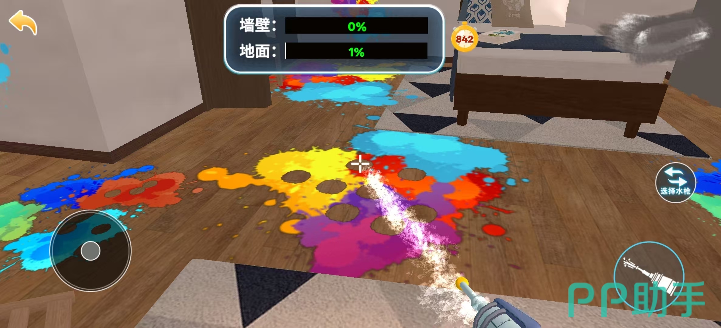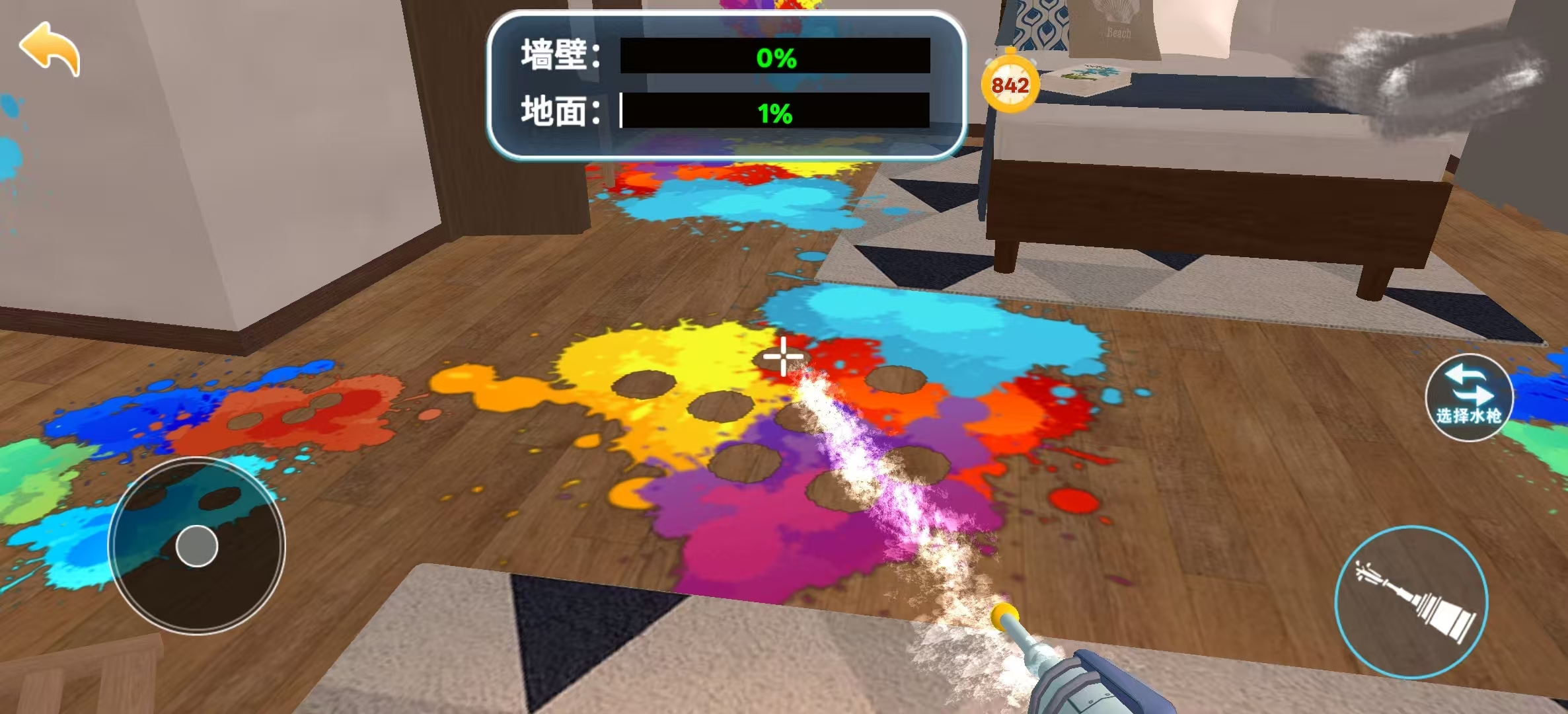 水枪不仅可以是童年时与好友嬉闹的玩具,也可以是清扫房屋的必杀技。在水枪清洁大师这款游戏中,玩家将利用水枪对脏乱差的空间进行清洗与整理。游戏一开局,玩家就会看到墙壁,地面上均沾染了五颜六色的颜料,玩家的任务就是操控水枪将颜料冲干净,清理过程中,玩家还可以查看清理的进度和选择合适的水枪工具。