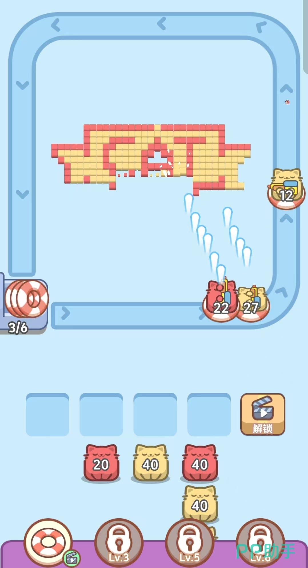 在小猫的派对上,水枪也起着大作用!游戏设置在一个河流传送带中间是一个由五颜六色的方块围成的拼图,小猫需要根据方块颜色依次上场,每个小猫都将坐上游泳圈在河里上转一圈消灭对应颜色的方块,直至所有的方块消除才算获胜。不过玩家还需注意小猫上上的数字,当转了一圈的小猫数字没有完全利用就会滞留在格子中,格子满了,游戏就失败了哦。