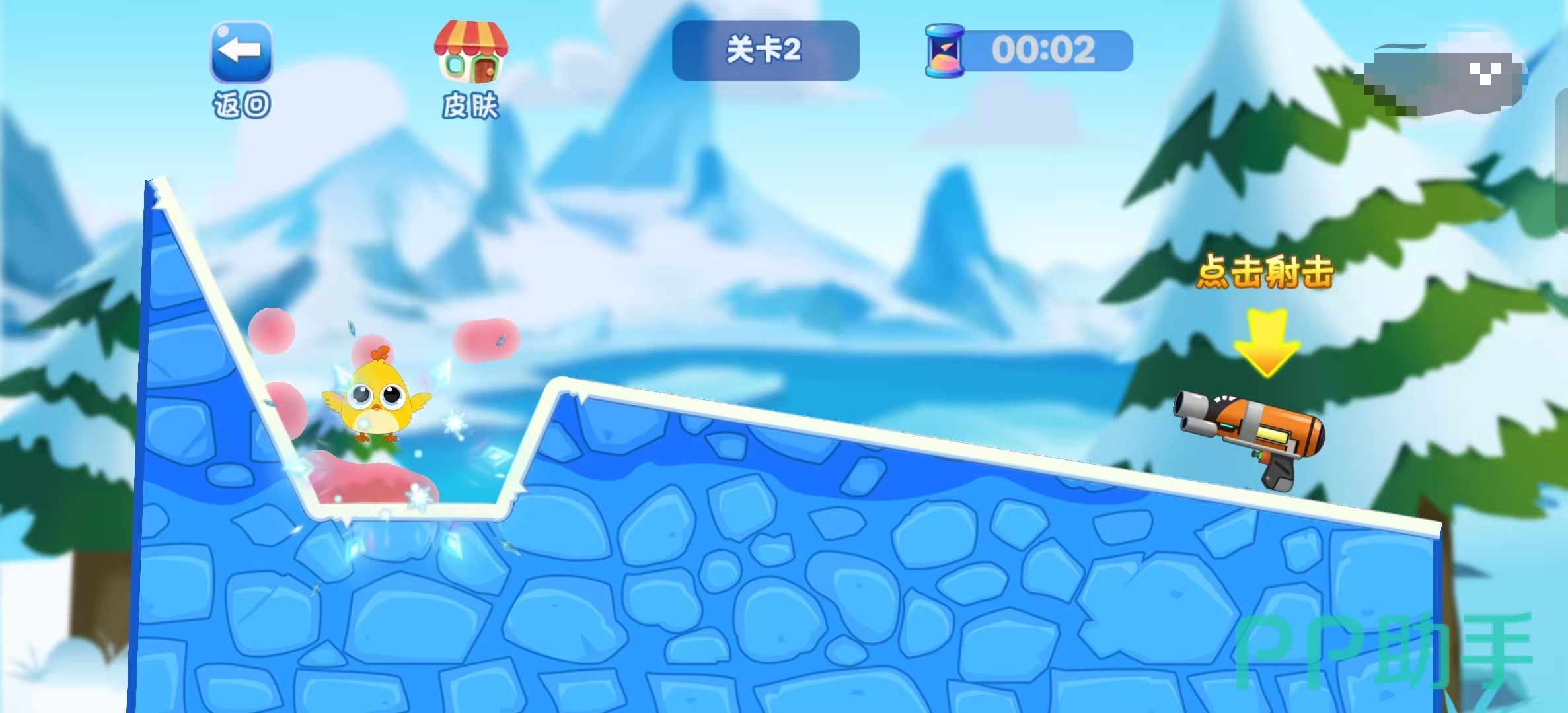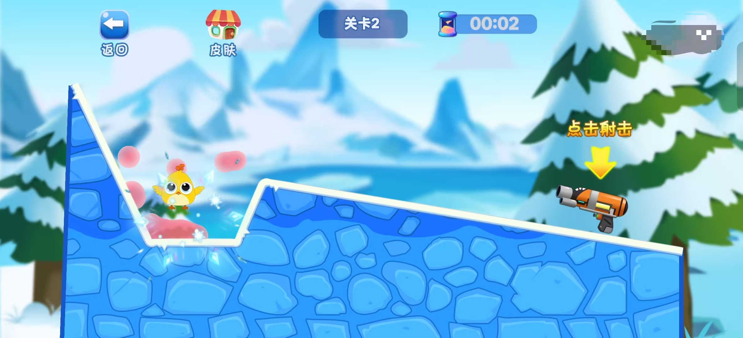 根据一些物理原理呢,水是可以加快冰的融化速度的,而对抗挑战赛的规则就是以此设计。玩家通过点击水枪进行射击,而射击的目标就是被困于冰块中的可怜的小鸟,玩家需要利用足够的水才能融化冰块,但时间可是有限的哦,玩家可得马上救出小鸟才行。解决冰冻小鸟的地图超级丰富,关卡难度也是随之增加,玩家可得注意角度哦。