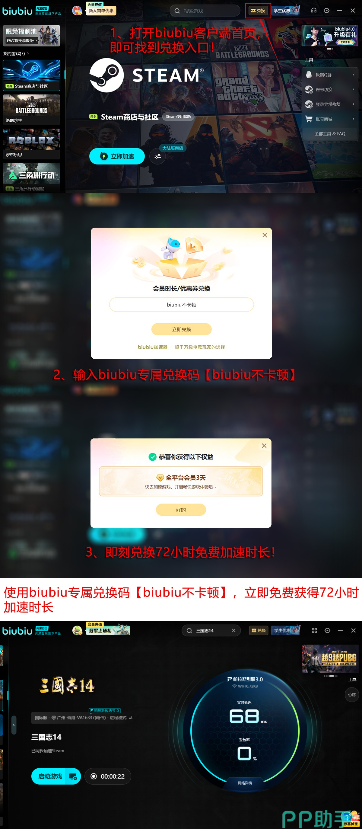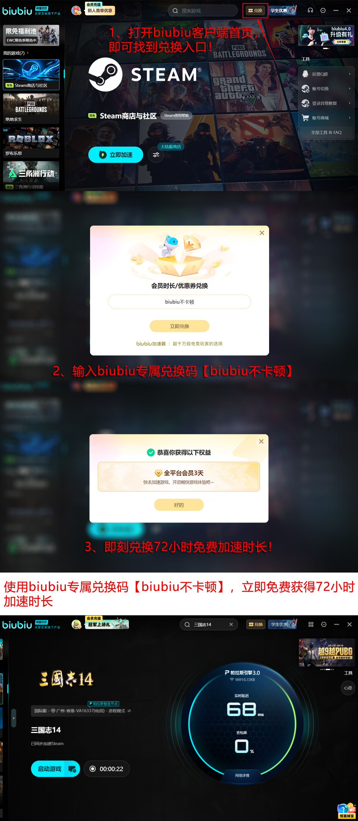 第一次使用biubiu加速器的新用户,只要完成注册就可以获得24小时的免费加速。此外,无论新老用户都可以输入兑换码biubiu不卡顿来获得72小时免费加速。这种无需付费就能现实体验快人一步的感觉,实在是妙不可言。