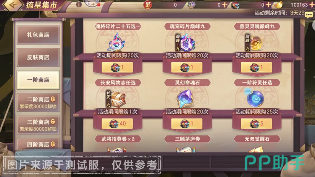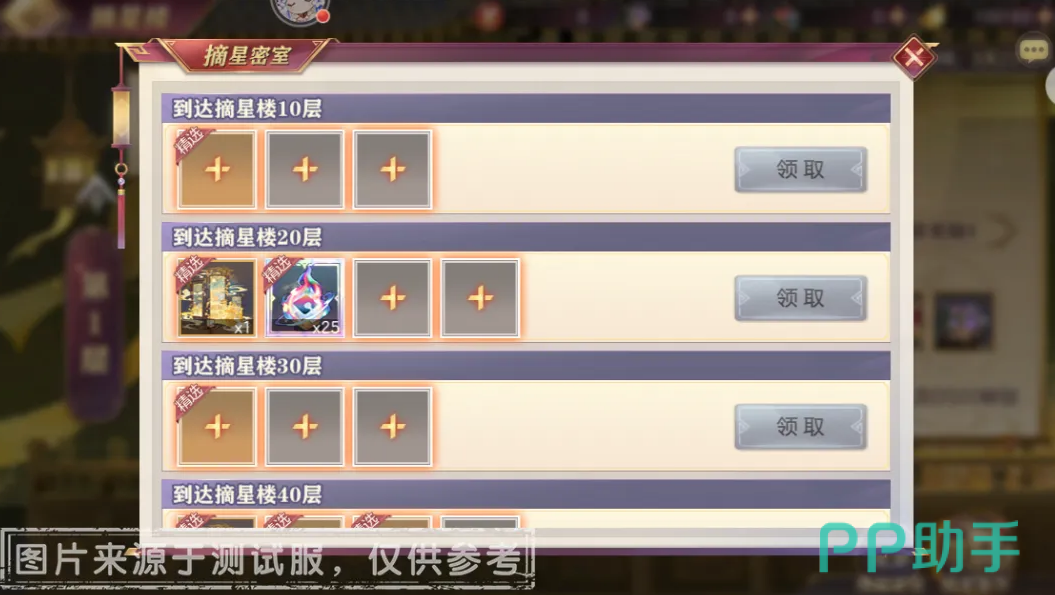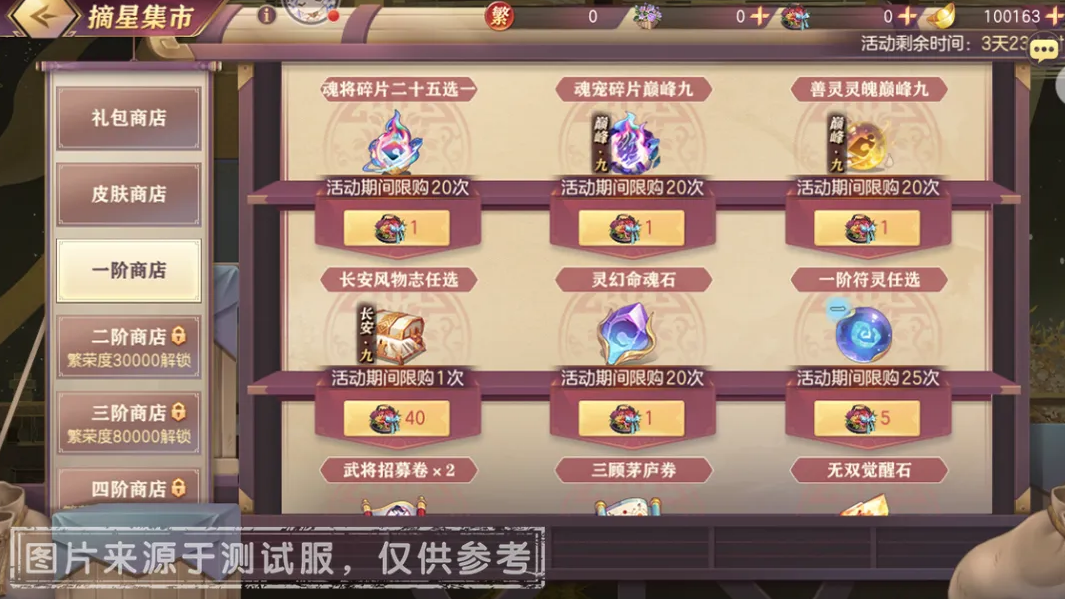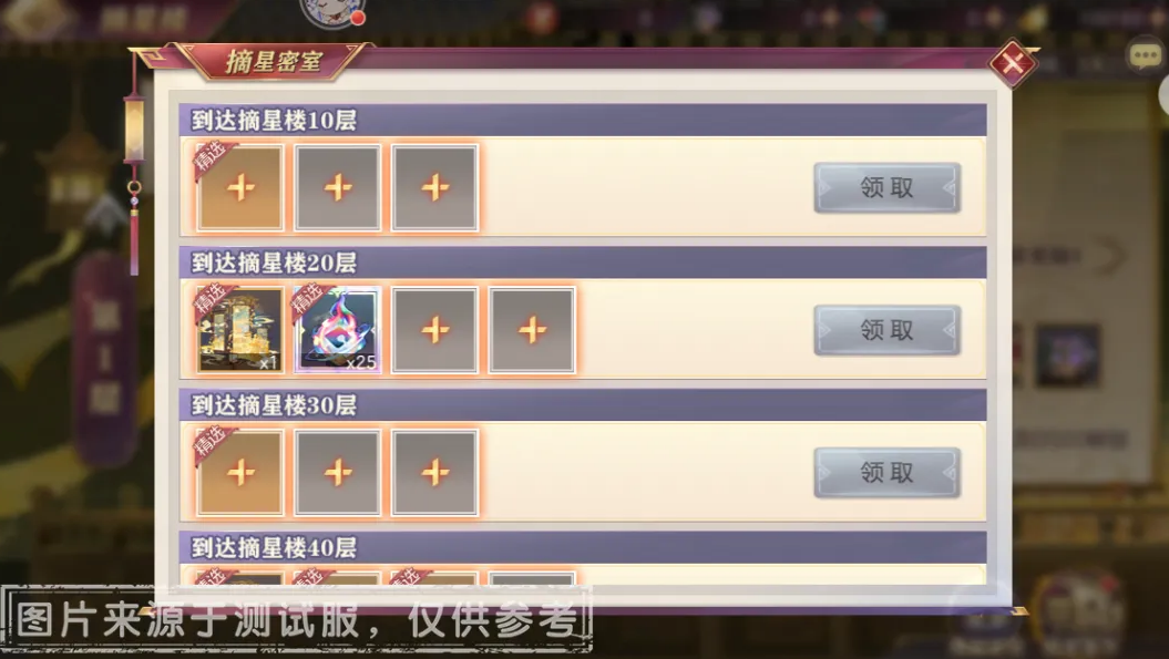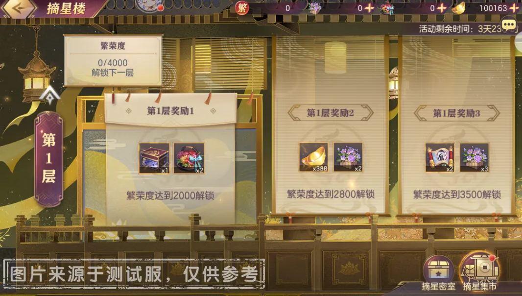 繁荣度累积够了,就能解锁「摘星楼」的各层奖励。烟花礼盒、庆典花篮、高级花篮这些都有。更重要的是,每解锁十层摘星楼,还能选一个「摘星密室」大奖——魂将碎片二十五选一、命魂信物任选巅峰九、魂宠碎片任选巅峰九、善灵灵魄任选巅峰九、风物志任选长安九、铸鼎象物风物志任选,全是硬通货,能选自己最需要的那个。