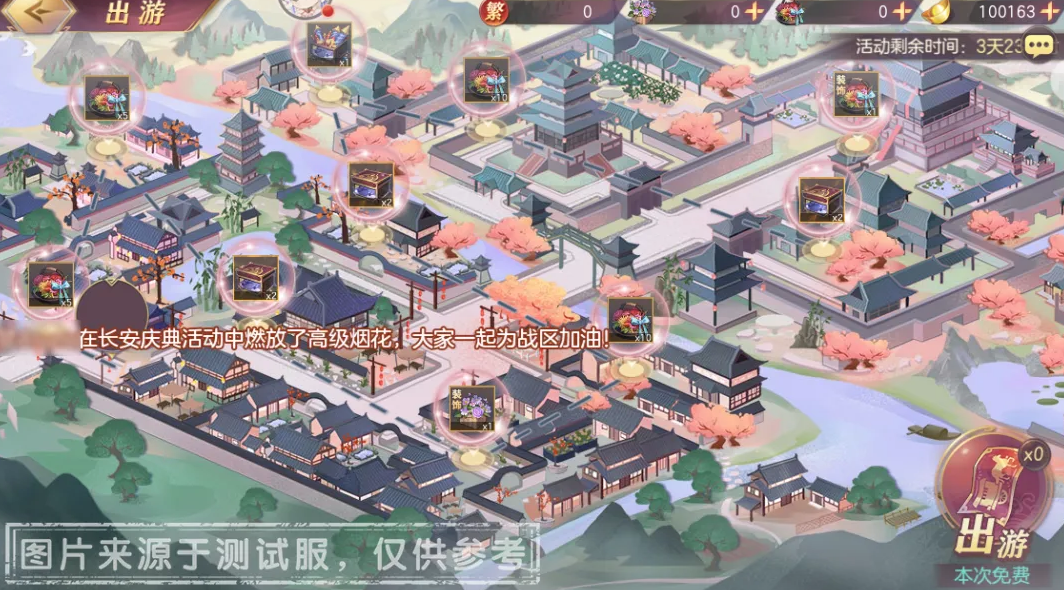 拿到出游券之后,去活动主界面右下角点「出游」进入界面。消耗出游券,可以随机游历一定步数,累积够指定步数就能领奖励,比如「烟花礼盒」和「高级花篮」这些。步数是随机增加的,所以具体几次能到不好说,多跑几次就行。