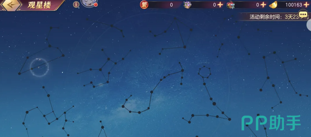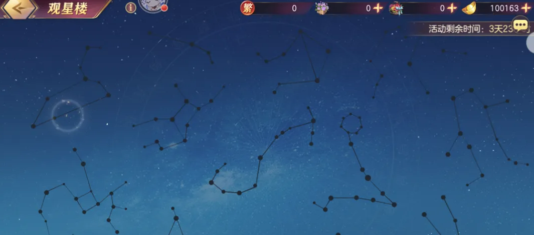 每天进活动界面左上角的「观星楼」,里面有个观星的小玩法,要把星图拖拽旋转到指定位置重合。操作不难,玩几次就熟了。每次观星会随机给88、188或者388元宝,还有1张「出游券」。一天可以观星三次,第一次观星完,还会随机附带一个星运效果。元宝收益看运气,但出游券必拿,因为后面用得上。