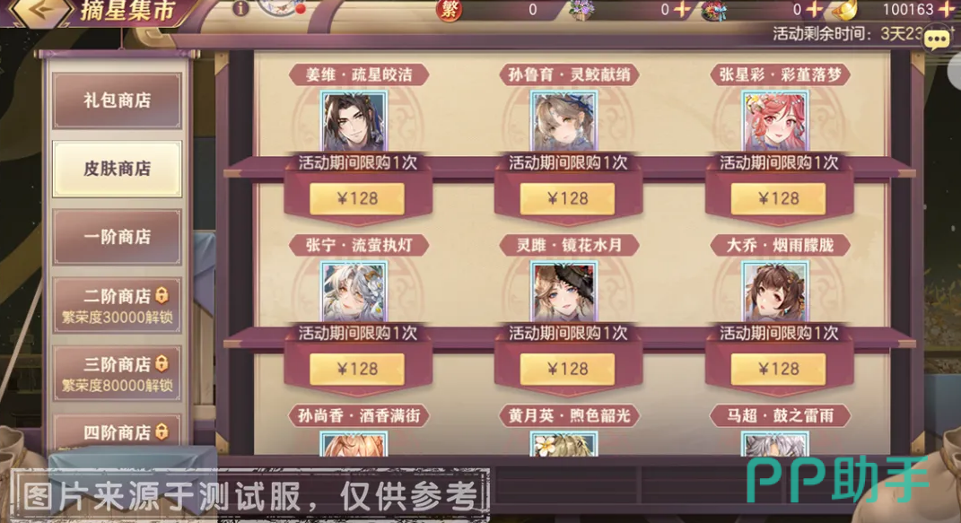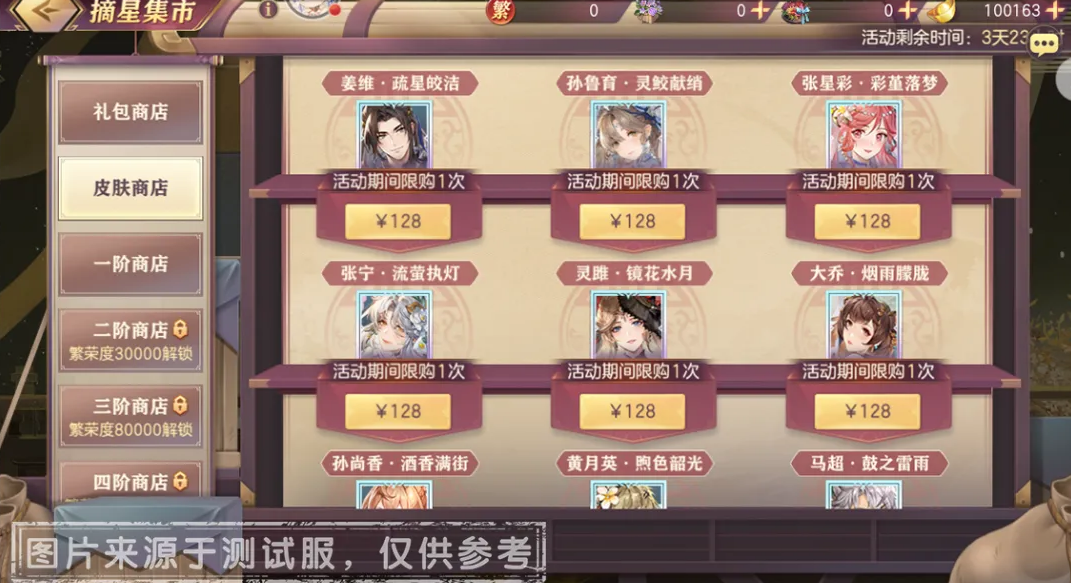 摘星集市那边,每天可以免费领一个烟花礼盒,500元宝可以买一个,每天限购30次。另外用「高级花篮」也可以换礼盒。集市里还有武将皮肤限时返场,姜维、孙鲁育、张星彩、大乔、孙尚香等不少武将,都有皮肤可以选,128元或者98元一套,有喜欢的可以看看。