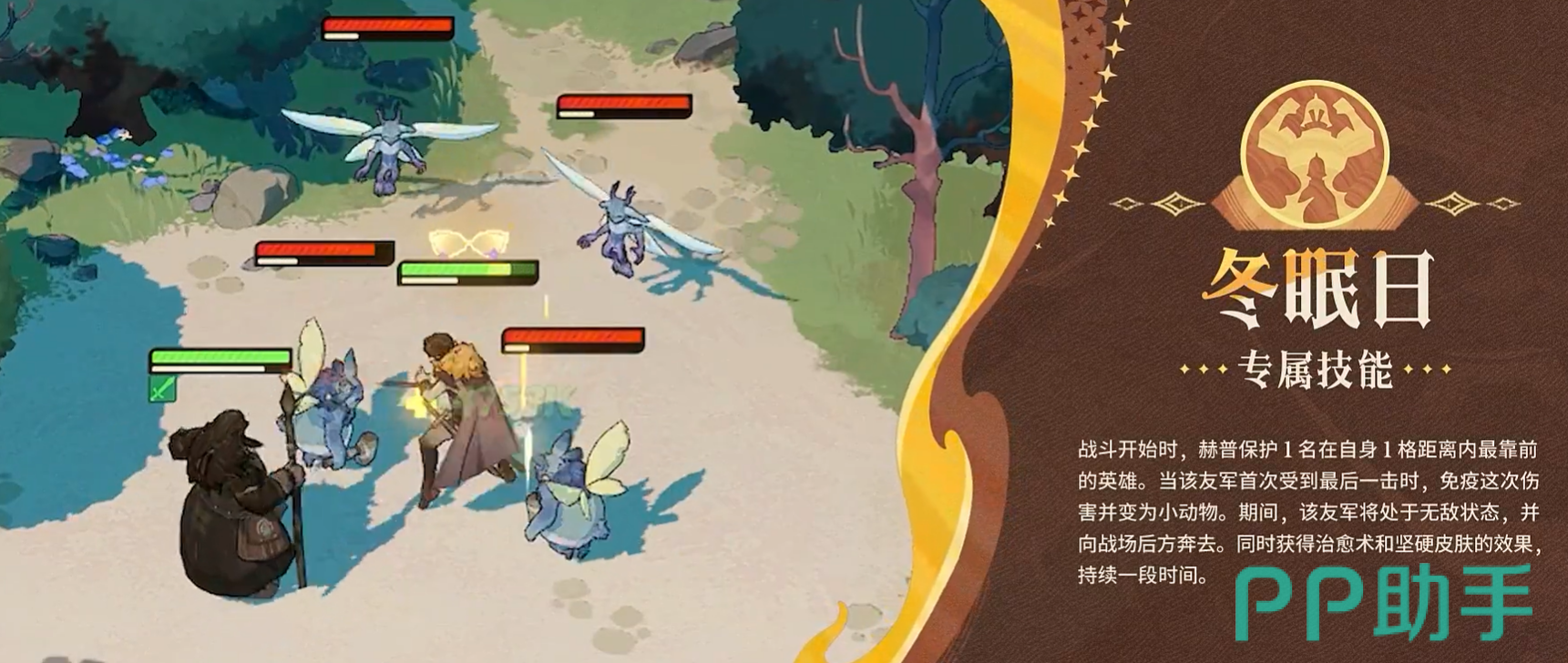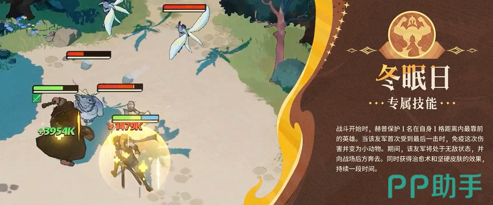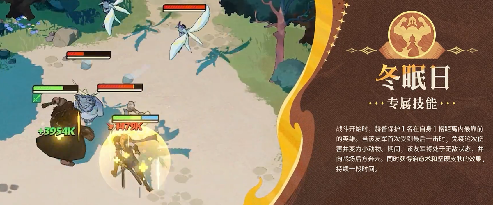 专属技能"冬眠日"是赫普的另一个亮点。战斗开始时,它会锁定距离自己1格以内最靠前的一名友军,保护对方。当那名友军第一次快要被一击打死的时候,直接免疫这次伤害,同时变成小动物,无敌状态并向后方跑去,还能获得治疗和护盾效果持续一段时间。这个机制在挂机关卡里特别好用,能救重点输出位一命,有时候就靠这个翻盘。