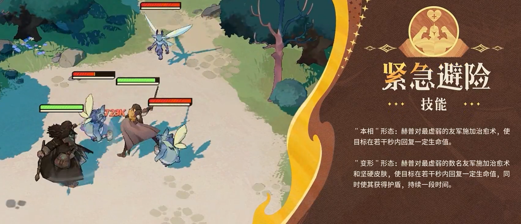 "紧急避险"在本相状态下是单体治疗,给队伍里血最少的那个友军回血。变形状态下升级成对几名友军同时治疗,还会附带一层护盾,这样即使赫普自己在前排吸引火力,后排也有一定的生存保障。这两个技能在变形形态下消耗1点火源,但强化的效果值得。