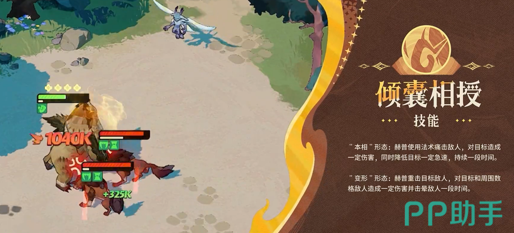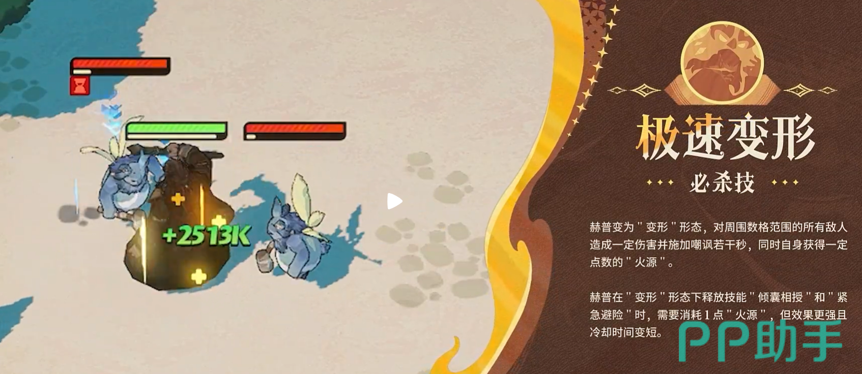 赫普最核心的东西,就是它的两种形态。平时它处于"本相"形态,用技能打打输出、治治队友,节奏比较慢。等到释放必杀技"极速变形"之后,就会切换成"变形"形态,对周围一定范围内的敌人,造成伤害并施加嘲讽,同时自身积累一些"火源"点数。进入这个形态之后,它的两个普通技能都会跟着变强,冷却时间也变短了,可以打出更高的压制效果。