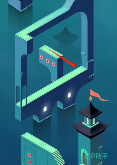 进入到小镇的场景中,眼前就会有错落有致的方块结构,看上去布局很简单,其实暗藏玄机。大家需要先滑到前面的绿色方块,为角色开辟一条基础的路径,紧接着右滑悬空的方块。让两个方块可以形成链接,这就是整个关卡的起始关键,在操作时顺序一定不可以颠倒,否则角色就没有办法顺利的通过。角色在顺利通过第1个场景之后,不要着急着移动方块,要把所有的注意力都放在右侧的旋转机关上,然后不断的旋转机关,调整整体的空间结构。