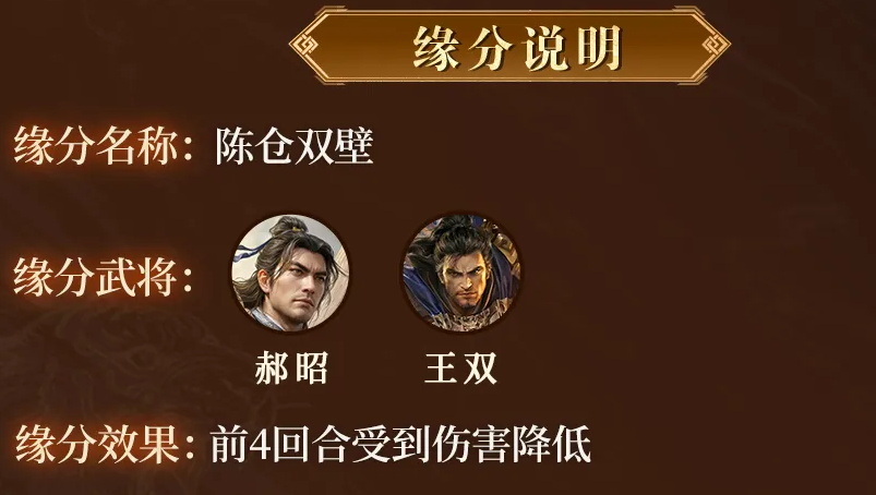 郝昭的缘分武将为王双,呼应陈仓之战中二人协同守城的历史背景。当郝昭与王双共同编入同一队伍时,我方部队在战斗前4回合内将享受伤害减免增益。此外,郝昭专属韬略可使其释放战法时,同步削弱敌方目标所受的谋略伤害降低类效果,进一步提升团队整体抗压稳定性。