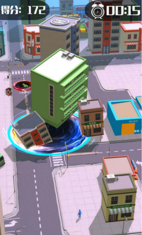 以现代都市为战场的多人同图对抗游戏。初始黑洞仅具基础吸附能力,需主动吞噬车辆、路灯、广告牌等环境物体快速扩大体积。地图具备动态视野遮蔽与障碍物碰撞机制,玩家需兼顾发育效率与战术走位,在有限空间内完成观察、预判与反制,最终达成生存压制目标。