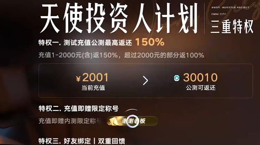 该计划共设三重递进式回报:第一重为充值返利,正式服上线后将以超额比例返还对应资源;第二重为限定身份标识——全服仅发放9999个“天使投资人”专属称号,该称号具备跨版本显示能力,上线即生效;第三重为好友绑定系统,测试期成功绑定的好友关系将在正式服启动时自动继承,助力新服初期资源获取效率显著提升。