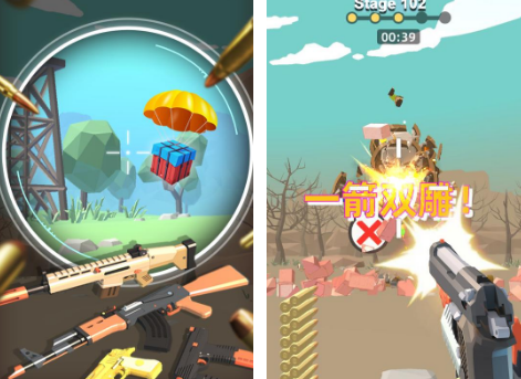 本作融合放置玩法与第一人称射击(FPS)机制,支持自动瞄准辅助与手动精准操控双模式切换。全游戏共设12个主题章节、240+关卡,武器库涵盖冲锋枪、狙击步枪、榴弹发射器等上百种装备,部分武器具备穿透、爆头加成、弹道折射等特殊属性。关卡设计强调环境互动,例如利用镜面反射子弹击中隐藏目标,或借爆炸气浪推动敌人至危险区域,实现“一箭双雕”式通关。