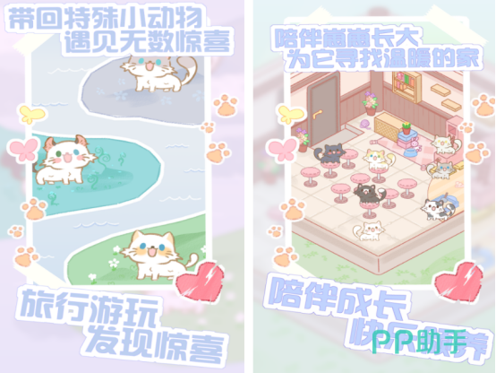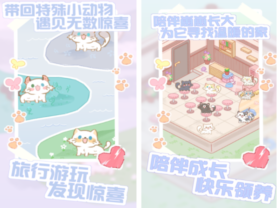 主打治愈系模拟经营体验。玩家从零开始建设专属农场,种植果蔬、饲养动物、接待访客;地图含多个主题区域,支持旅行探索,随机触发小动物结伴事件;猫咪图鉴涵盖纯色、双色、三花、重点色等上百种毛色变体,均可通过互动培养逐步解锁。整体画风清新柔和,UI动效细腻流畅。