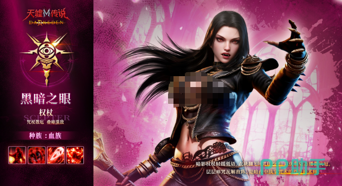 第二个的话,黑暗之眼在血族当中负责远程控制的能力是不错的,可以搭配的武器是权杖,这里诅咒的范围攻击包括各种负面效果都可以通过这个职业带来,对于敌人来说,有这个角色在场上,那么输出一举一动都会受到很多的影响,所以如果玩儿团队类型的作战,比如说公会战里面,就可以用来削弱敌人,建议在后期加点效果当中一定要注意,诅咒技能的这些时间非常重要。
