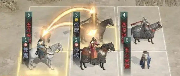 第一个给大家推荐的是孙权拼点队,其中用到的是孙权、徐庶、郭嘉,他们可以让拼点作为这里的核心机制,这样可以频繁的触发更多拼点几率的时候,我方的技能在联动效果上面会更好一些,然后后期通过控制爆发就可以带来整体阵容的强度了,这里要注意孙权,他一般是不战追击格子的,徐庶、郭嘉站在孙权的追击格子上面就可以了,然后在这种效果当中,郭嘉带一个十胜十败的能力就可以保证他技能的循环概率,后期通过智力比拼这个环节,郭嘉不仅可以带来更多的直接伤害,还可以带来胜机这类增益状态的叠加。