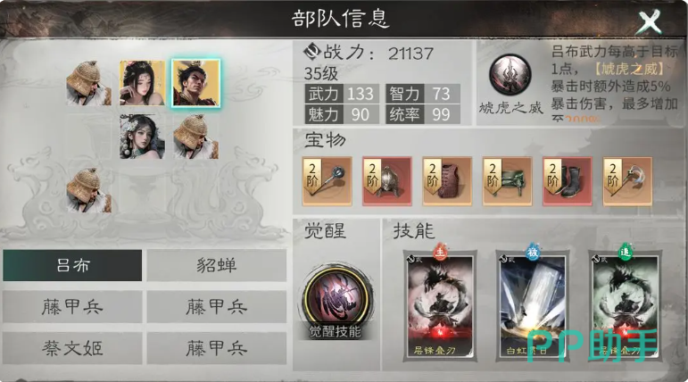 因为他在初始情况下,如果是对单体敌人造成输出的话,这里百分比不算很高,也算是吕布自身的一个短板,所以想要带来更高的单体伤害,这里一定需要针对敌人目前兵力最低的一个目标进行锁定,而后期在觉醒伤害效果上面,可以触发天赋的能力就很厉害了,一般在天赋能力当中他只要是等级1的斩杀效果,在这里进行触发,就可以带来一次追击,而且根据这样的天赋他进行觉醒的话,后期能够搭配的阵容也比较多,比如说貂蝉、蔡文姬、吕布这三个成员搭配在一起的话,大家看到每一个武将他们中后期都可以带来更强势的能力,比如貂蝉跟吕布最少要达到金色阶段这个品质,当中的他们在天赋能力上面基本都是达到了三级效果的,所以此时阵容的能力是达到最强的一个阶段。