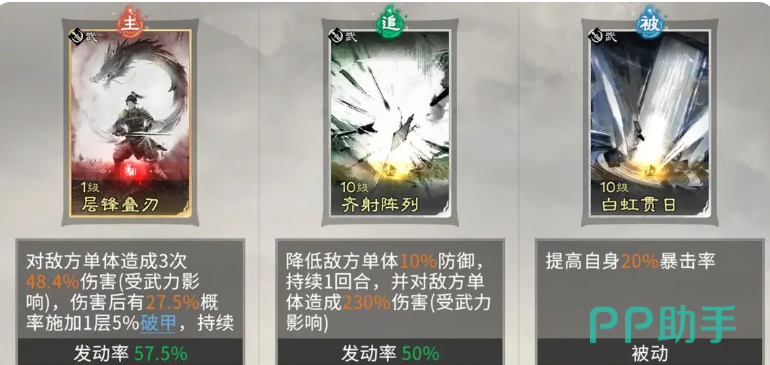 但是大家要注意,他同时有两个技能装备层锋叠刃这个技能卡的话,自身的品质是一定要达到金色,才可以进行装备,要不然的话,其中技能装备的次数也是受限制的,而另外其他的几个成员当中,蔡文姬就要带首尾相援,这样的话治疗能力才可以跟得上,为我方其他的成员都可以带来一部分的治疗效果,貂蝉的话凌波微步是要带上的,这样不仅可以给我方全体的成员带来一部分的治疗,还可以带来闪身类型的闪避效果,后期在通权达变这类追击效果也装备上的时候,还可以减少敌人身上12%的防御以及各类睡眠的控制,所以在搭配成功的时候,我方整体阵容能够触发吕布追击格子的加成啦,同时大家也可以快速的触发这里破甲的能力。