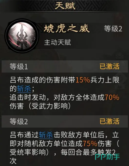 吕布自身的天赋效果可以带来的斩杀能力是非常强的,特别是他在造成伤害之后,一般是负担了15%的兵力上限,触发这里斩击的时候,触发追击还可以造成70%左右的额外伤害,另外他后期在对敌人进行输出的时候,还可以触发一个武力比拼,武力数值胜过敌人一次的时候,可以增加吕布自身两点的输出,以及1%的斩杀伤害,他这里的天赋是可以针对自身能力带来更多次数的基础属性提升的,不过十分依靠追击的效果,只要有更多次追击行动的回合,才可以带来更多的斩杀,所以他一般情况下站位是非常重要的,只有吃满另外两个队友身上的追击格子,这里天赋技能才可以带来强大的能力,后期在斩击效果以及上限上面有所提升的话,他这里能够带来的自身输出增幅就非常大,他的觉醒技能其实也是弥补了自身在天赋技能效果当中的伤害。
