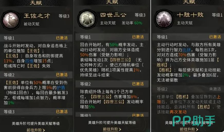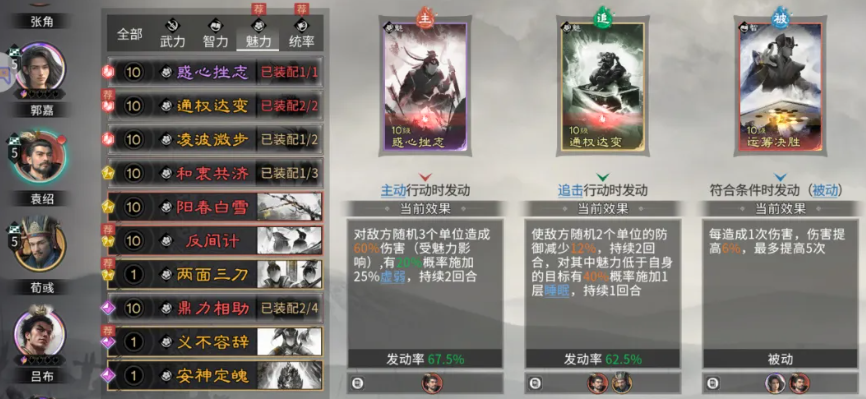 那么在追击各自的权限上面,大家也要注意,他们达到这样的品质才可以进行触发,而后期3个人进行搭配时,袁绍自身带的天赋,叫做王佐之才,在这里跟其他成员进行搭配,就可以给他挂上足够多的王佐效果了,可以让袁绍在输出的时候有11%的攻击加成,而另外袁绍自身的天赋在这里也是可以给对面群体造成伤害,然后大家可以连接郭嘉的天赋十胜十败,触发更多的群伤能力,这样的话在所有己方成员天赋效果可以发动的时候,大概率是可以造成更多群伤,那么在前期主动权上面基本就可以靠在我方手上了,另外袁绍的技能大家可以选一个惑心挫志,这样的话,不仅可以打出来更多的群体伤害,还可以给敌方挂一些虚弱状态的影响。