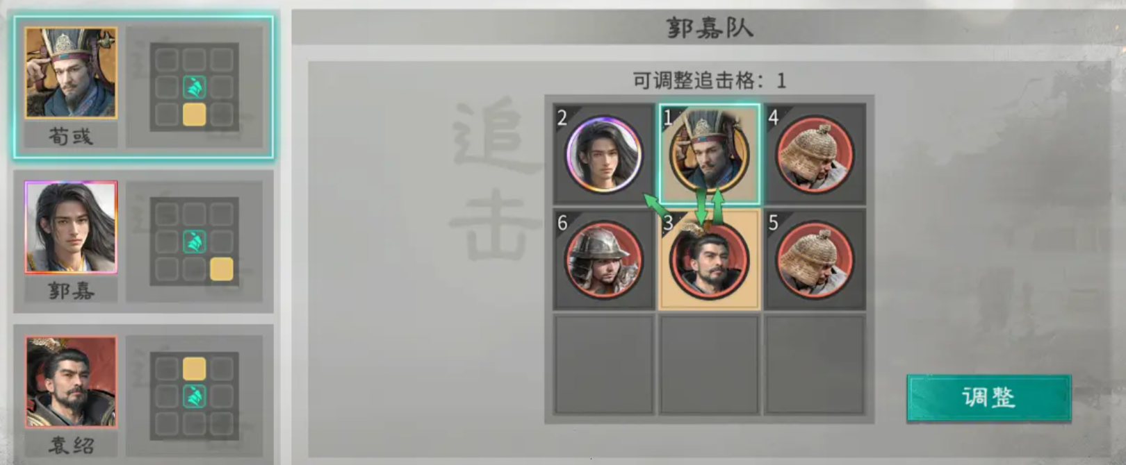 包括荀彧在用做辅助的时候,后期在队友加更多伤害的时候也可以保证两者的生存,这样这个阵容翻车的概率也不大了,另外,在前排大家还可以放藤甲兵来作为抗伤,站位效果的后排大家可以放穿杨军,这样队伍的输出也不会存在缺口,那么队伍有足够的输出得到加强之后,大家就要注意袁绍必须站在荀彧和郭嘉的追击格子上,这样的话才能拿到荀彧他自身技能王佐这部分的增益提升,而且在追击技能触发的概率上面也会更高一些,荀彧的话也要踩在袁绍的追击格式上面,这样的话双向的增益效果才能生效,在郭嘉这个人物的站位上面,大家就不用关注他的追击格子了,因为这里他进行补位的话,站在选择稍微近一点的地方就可以了,不过在上阵的时候,这3个英雄最好都要升级到鎏金的品质才会好用。
