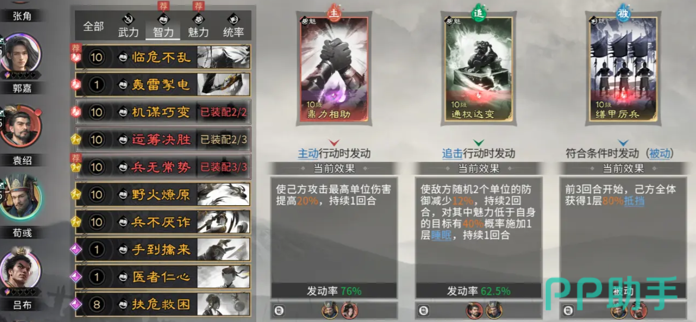 而且在追击技能上面,可以给他搭配通权达变,这样的话,还可以让睡眠这个状态的影响更多一些,另外被动技能效果上面带运筹决胜就可以了,这样可以让他在伤害数值的基础上面再增加6%,有这样的技能搭配的情况下,袁绍也会更好用一些,而在他四世三公这类技能可以多次触发的时候,自身的天赋能力增数就可以快速叠满状态,后期伤害也可以直接直线上升来快速碾压对面,荀彧在主动技能上面搭配了鼎力相助之后,也可以专门给我方攻击数值最高的一个单位加上伤害,毕竟这里袁绍他的输出伤害就已经足够高了,所以通过荀彧这样的一个强化,再加上王佐效果的强化,叠加起来之后,袁绍的输出就能更快的提升到另外一个爆发阶段,然后加上控场角色郭嘉在这里带上一些群伤,对于残血敌人来说是可以直接击破的。