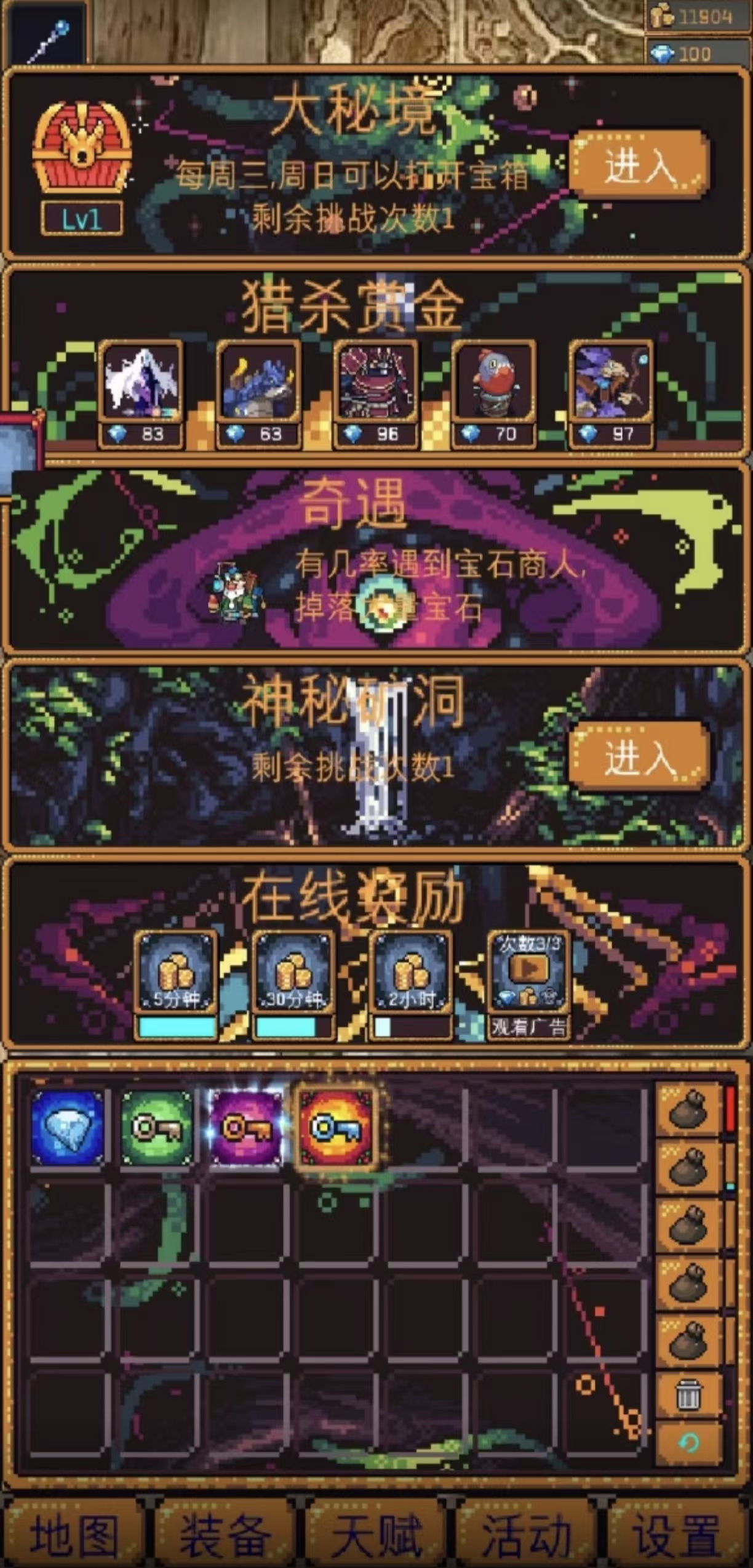 高难度垂直洞窟Roguelike代表作,共设数百层随机生成迷宫。玩家需在有限血量与背包容量下,权衡探索深度与返程风险。技能系统支持分支学习路径,装备具有耐久与词缀双重属性,宝箱分布、陷阱类型、怪物组合完全不可预测。每局均为独立存档,强调单局策略决策与长期BD积累。