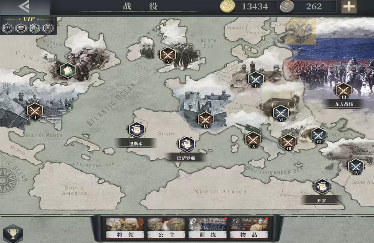本作为一战主题策略模拟作品,以1914年欧洲列强对峙为起点。玩家通过征兵、编组军团、参与史实战役推进主线;同步经营国家内政,包括宫殿升级、科技研发、外交结盟及角色养成(含公主等特色人物),实现军事与政治双轨发展。