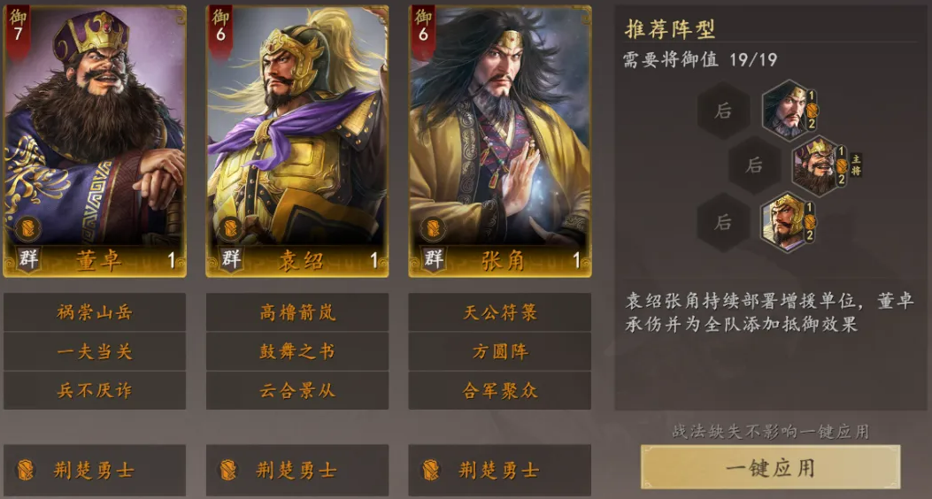 战术逻辑清晰:董卓担任主将,布设方圆阵。其技能可在每回合初始阶段优先削弱敌方统率,并为全体友军提供属性增益及抵御状态。抵御效果对召唤单位尤为关键——因召唤物基础血量偏低,该减伤机制能有效延长其存活轮次。配合鼓舞之书与云和景从,形成双层防御补充链:当首轮抵御被清除后,云和景从可触发后手补防;回合结束时,鼓舞之书再为全队恢复兵力,整体续航表现稳定可靠。