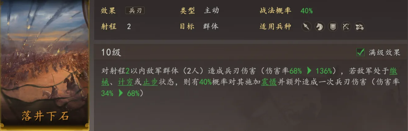 阵容结构简洁明确:刘备作为功能性辅助,提供白毦兵技能所附带的两格范围内止步效果;主公与关羽构成双核输出。若追求极限爆发,主公可装配搴旗斩将或无坚不摧,凭借其基础速度高于关羽的特性实现先手破防,为关羽后续连击创造理想条件。另可搭配落井下石战法,对处于止步状态的目标触发震慑控制,但须确保主公与刘备站位相邻,否则战法生效范围无法覆盖被控目标——此细节常被新手忽略,需特别注意。